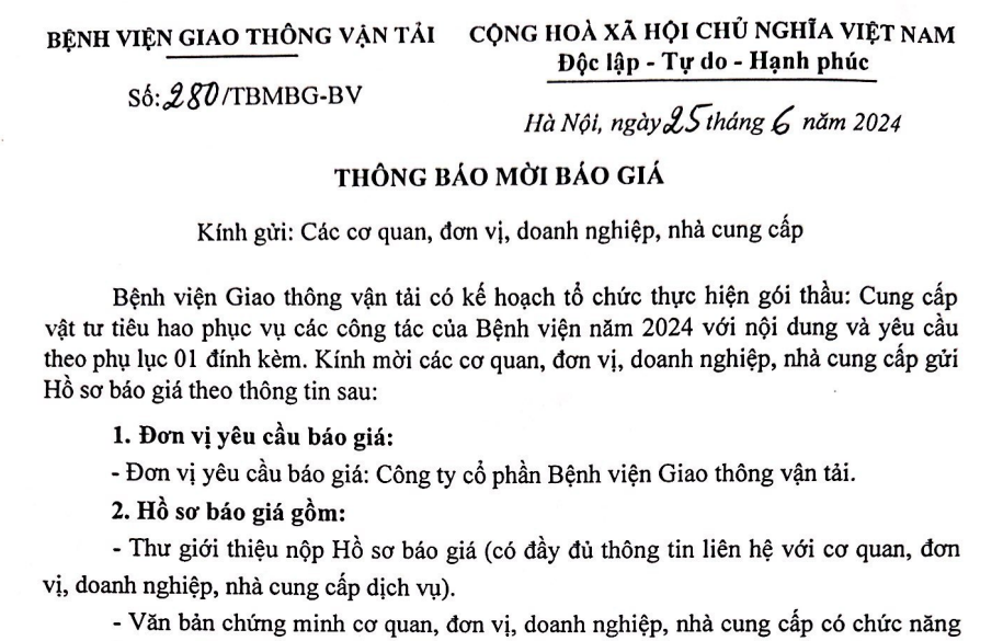 2024.06. Thông báo mời báo giá: Cung cấp vật tư tiêu hao phục vụ các công tác của Bệnh viện năm 202419:12 - 25/06/2024Yêu cầu báo giá, VTYT-HC Bệnh viện, Tải xuống TB-MBG 280 Ngày 25-6-2024.pdfChia sẻ: