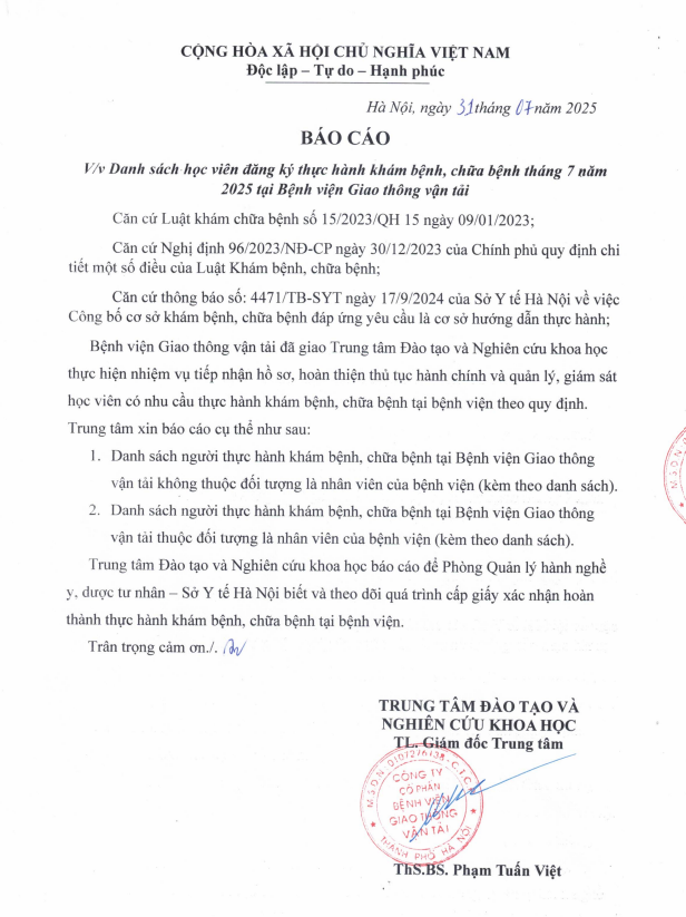 Bệnh viện Giao thông vận tải giao Trung tâm Đào tạo và Nghiên cứu khoa học thực hiện nhiệm vụ tiếp nhận hồ sơ, hoàn thiện các thủ tục hành chính và giám sát quản lý học viên có nhu cầu thực hành khám bệnh, chữa bệnh tại bệnh viện theo quy định. Trong tháng 7 năm 2025, bệnh viện đã tiếp nhận và ký hợp đồng thực hành với các học viên.