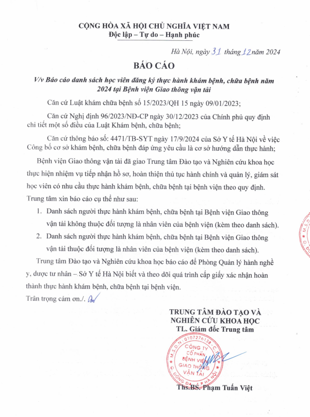 Báo cáo danh sách học viên đăng ký thực hành khám bệnh, chữa bệnh năm 2024 tại Bệnh viện Giao thông vận tải15:04 - 14/01/2025Thông tin chung, Thông tin, Tải xuống bcth t12-24.pdfChia sẻ: