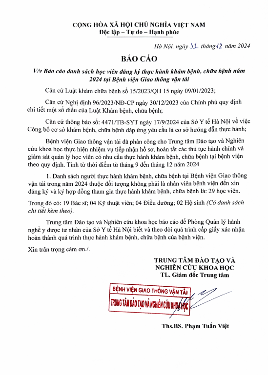 Báo cáo danh sách học viên đăng ký thực hành khám bệnh, chữa bệnh năm 2024 tại Bệnh viện Giao thông vận tải15:04 - 14/01/2025Thông tin, Thông tin chung, Tải xuống Báo cáo DSTH 2024.pdf Tải xuống ds học viên th bvgtvt 2024.xlsxChia sẻ: