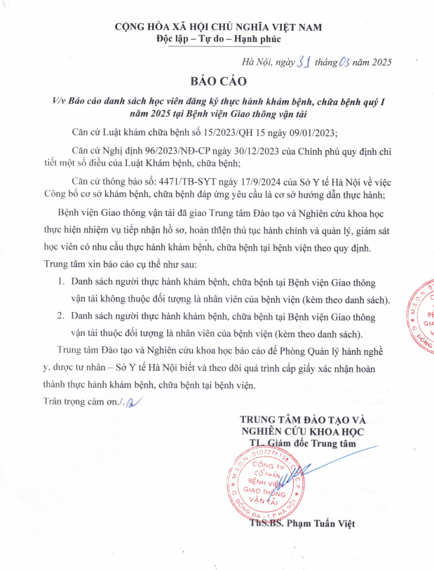 Báo cáo danh sách học viên đăng ký thực hành khám bệnh, chữa bệnh quý I năm 2025 tại Bệnh viện Giao thông vận tải09:49 - 09/04/2025Thông tin chuyên môn, Thông tin chung, Tải xuống bcth t3-25.pdfChia sẻ: