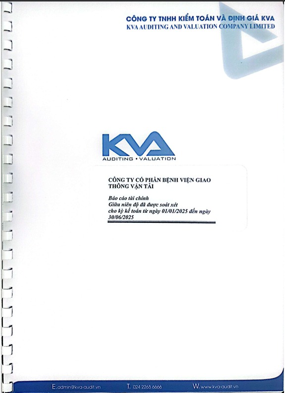 Báo cáo tài chính giữa niên độ 2025 đã được soát xét15:40 - 15/09/2025Quan hệ cổ đông, Thông tin chung, Hoạt Động Tài Chính, Phòng Tài Chính Kế Toán, Ban Giám đốc Công ty cổ phần Bệnh viện Giao thông vận tải (sau đây gọi tắt là "Công ty") trình bày báo cáo của mình và Báo cáo tài chính của Công ty cho kỳ kế toán từ ngày 01/01/2025 đến ngày 30/06/2025. Tải xuống Báo cáo tài chính giữa niên độ 2025 đã được soát xét (final).pdfChia sẻ: