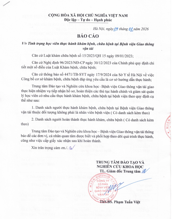 Trung tâm Đào tạo và Nghiên cứu khoa học - Bệnh viện Giao thông vận tải giao thực hiện nhiệm vụ tiếp nhận hồ sơ, hoàn thiện các thủ tục hành chính và giám sát quản lý học viên có nhu cầu thực hành khám bệnh, chữa bệnh tại bệnh viện theo quy định cụ thể như sau: