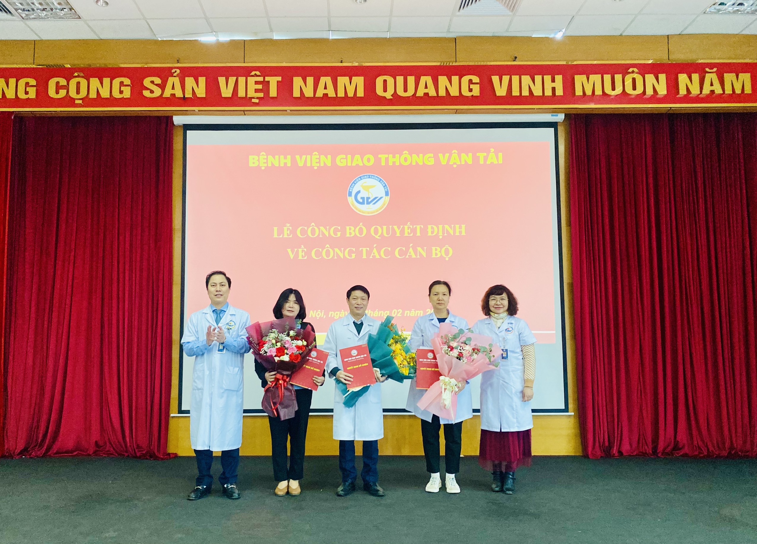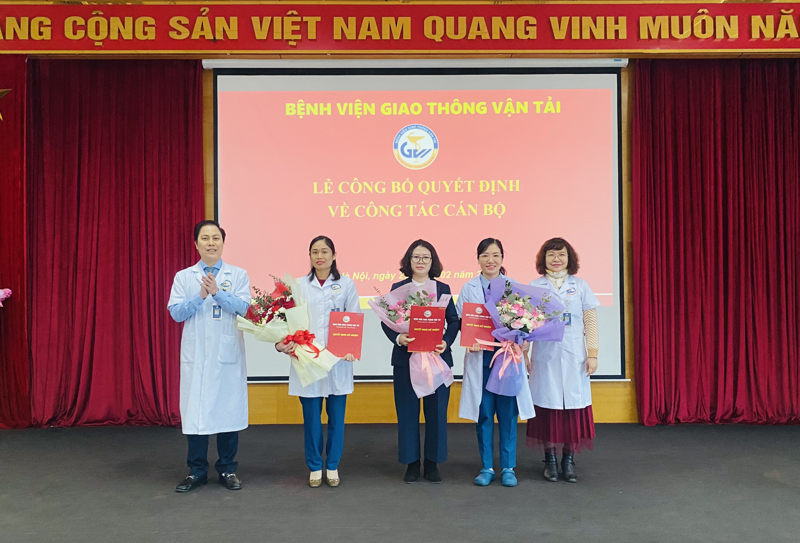 Theo các Quyết định, ThS. Đào Thị Thanh Huyền - Phó trưởng phòng Phụ trách phòng Tài chính kế toán được bổ nhiệm giữ chức vụ Trưởng phòng Tài chính kế toán; BSCKII. Nguyễn Thị Thu Hà - Trưởng khoa Hồi sức tích cực, Phó trưởng phòng Phụ trách phòng Tổ chức nhân sự được bổ nhiệm giữ chức vụ Trưởng phòng Tổ chức nhân sự; BSCKII. Bùi Hồng Giang - Trưởng khoa Cấp cứu, Phó trưởng phòng Phụ trách phòng Kế hoạch tổng hợp được bổ nhiệm giữ chức vụ Trưởng phòng Kế hoạch tổng hợp. ThS.BS Cao Mỹ Hằng được bổ nhiệm vị trí Phó trưởng khoa Phụ sản sơ sinh; BSCKI. Trương Thị Nga được bổ nhiệm vị trí Phó trưởng khoa Thận tiết niệu - Lọc máu và bổ nhiệm cử nhân Hoàng Thị Ánh Nguyệt giữ chức vụ Phó trưởng phòng Tài chính kế toán.
