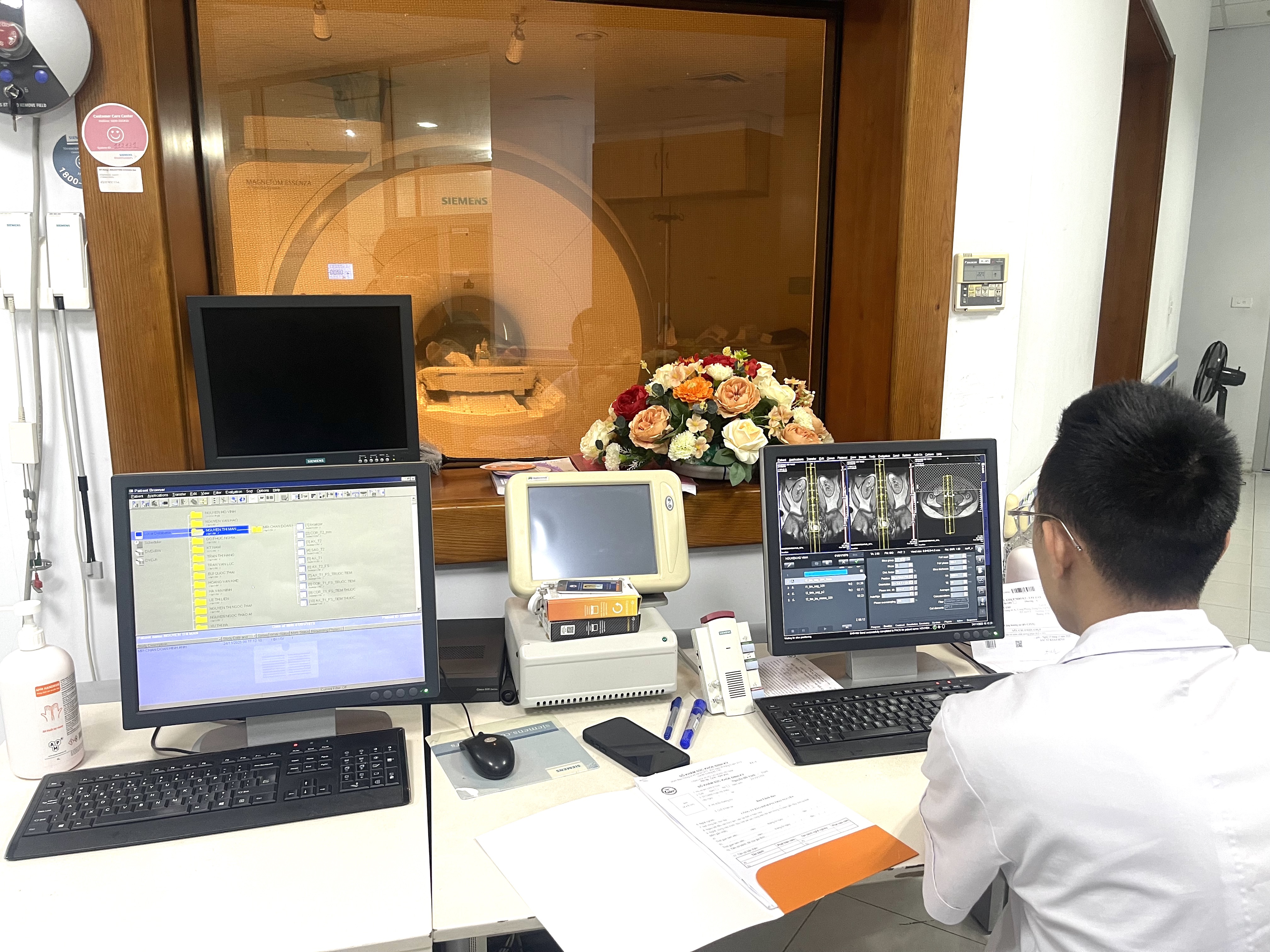 Cán bộ nhân viên PVI Thái Nguyên chụp MRI cột sống.