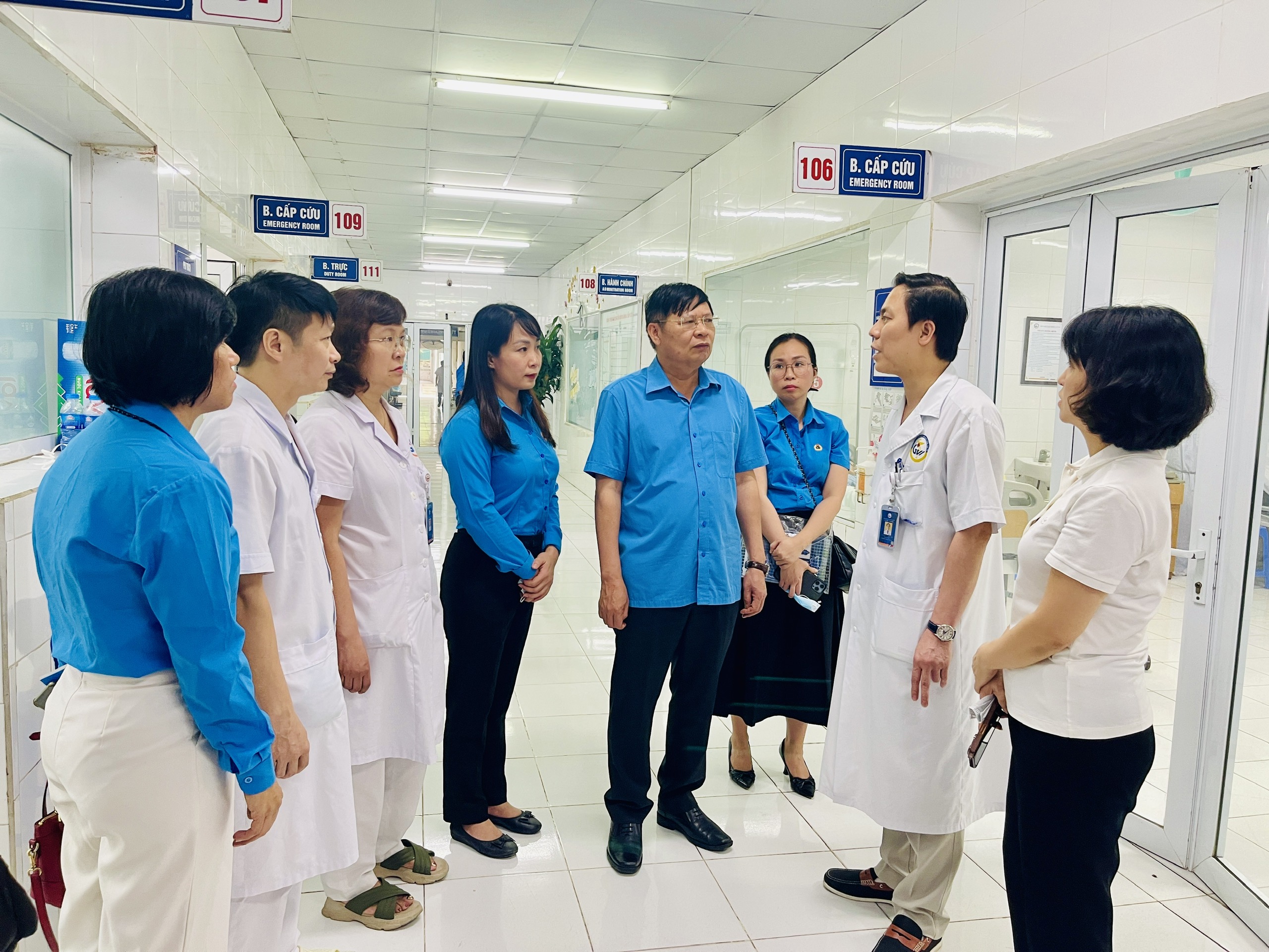 Phó Chủ tịch Tổng LĐLĐVN Phan Văn Anh trao đổi với Ban lãnh đạo Bệnh viện Giao thông vận tải về tình hình sức khỏe của các nạn nhân