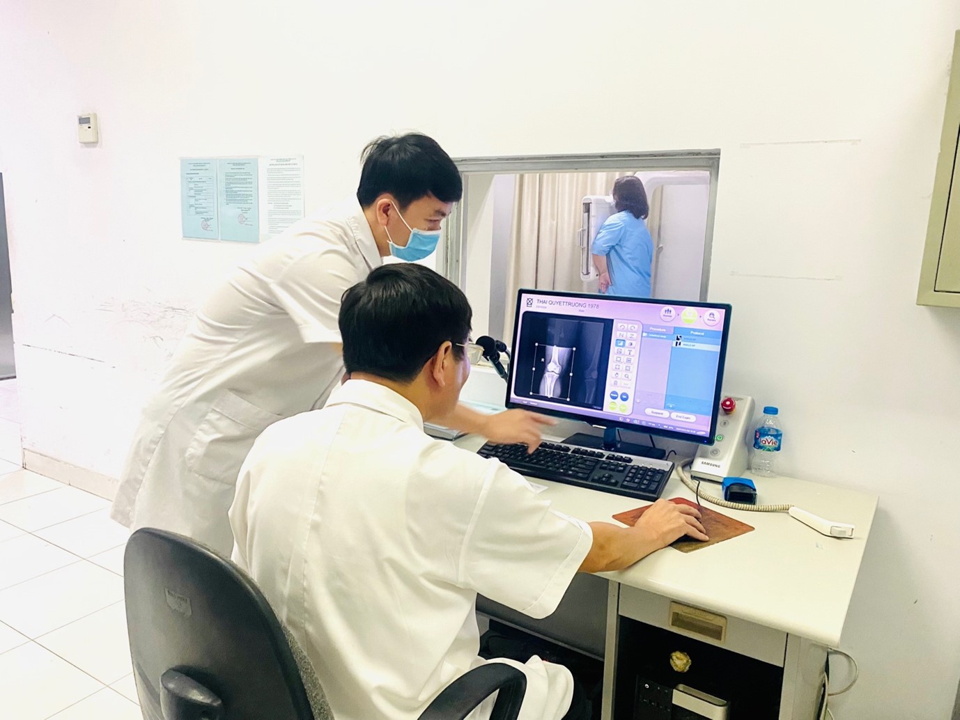 Các y, bác sĩ chụp X-quang cho người lao động khám sức khoẻ định kỳ.
