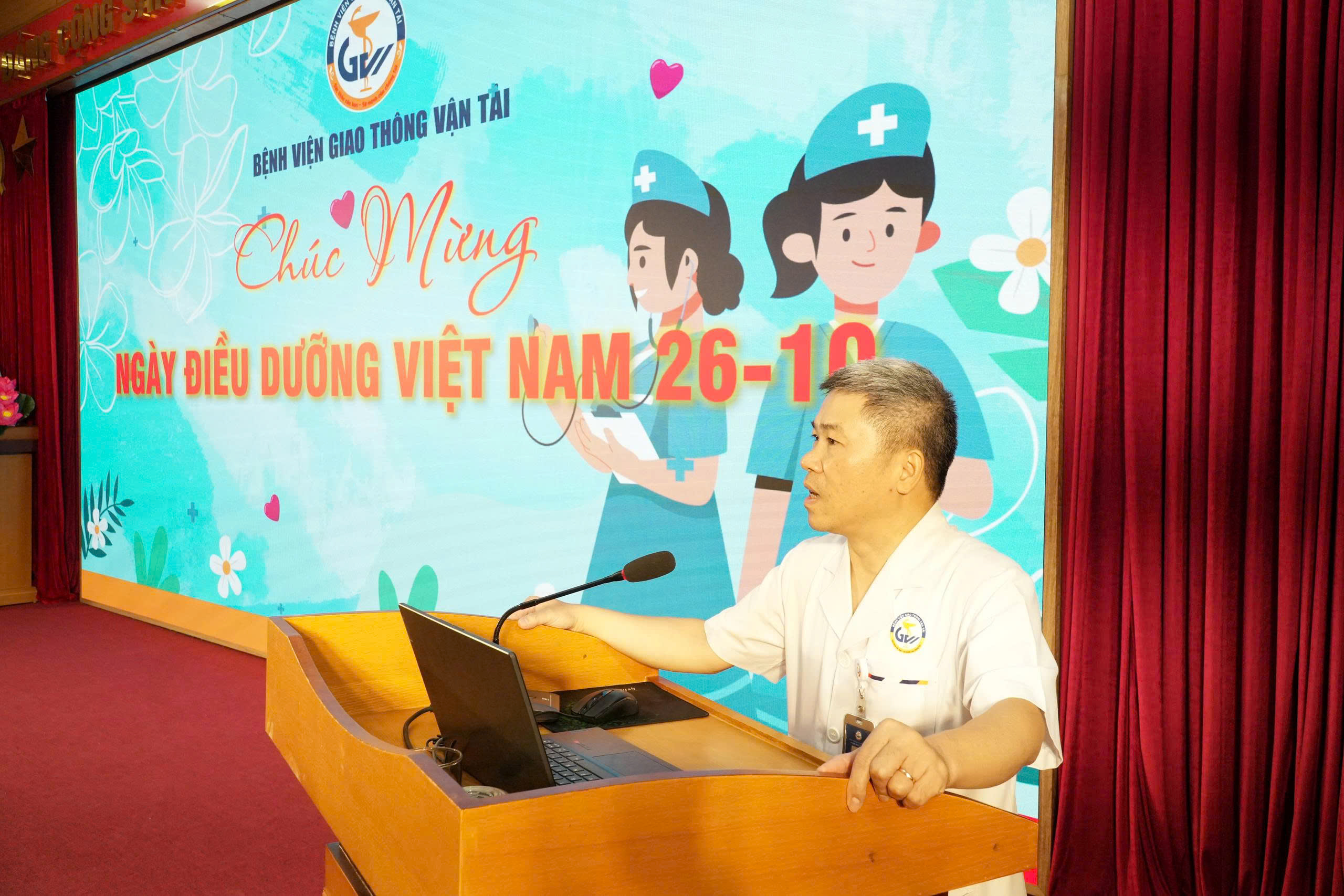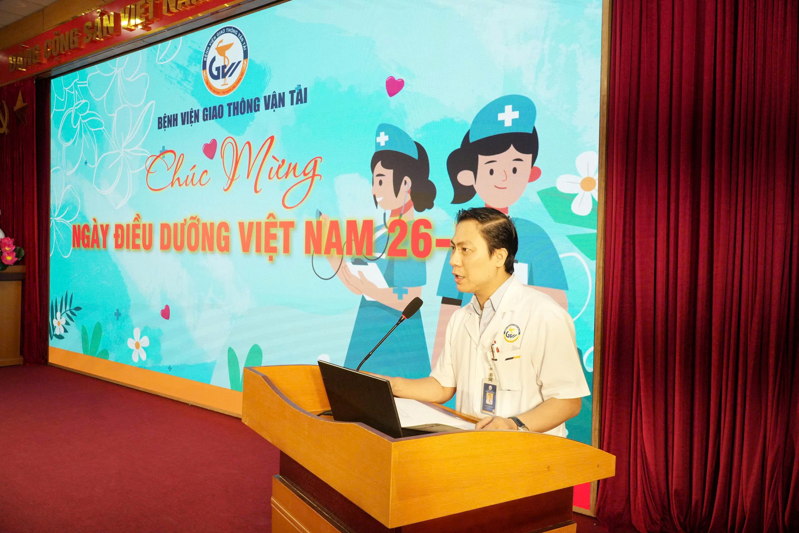 Phát biểu tại buổi lễ, TS.BS Bùi Sỹ Tuấn Anh - Bí thư Đảng ủy, Giám đốc Bệnh viện cho biết “Sinh thời, Bác Hồ trong thư gửi Lớp y tá tháng 2/1949 đã căn dặn “Y tá là những chiến sĩ đánh giặc ốm vì sự khang kiện của giống nòi. người y tá phải giàu lòng bác ái hy sinh”. Thực hiện lời dạy của Bác Hồ, trong suốt 70 năm xây dựng và phát triển, cùng với đội ngũ y, bác sĩ của Bệnh viện Giao thông vận tải, tập thể điều dưỡng viên của Bệnh viện đã không ngừng nỗ lực, tận tâm, tận tụy với nghề. Dù ở bất kỳ vị trí công tác nào, từ phòng khám, khoa nội trú đến phòng cấp cứu hay hồi sức, các đồng chí luôn là những người gần gũi nhất, chăm sóc người bệnh bằng cả y thuật và tấm lòng nhân ái”.