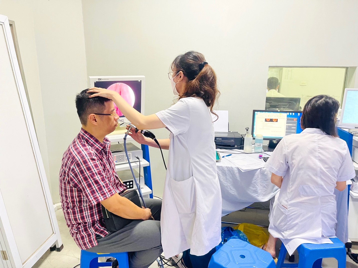 Các bác sĩ thực hiện nội soi Tai – Mũi – Họng cho cán bộ nhân viên Công ty Cổ phần Điện tử và Tin học Việt Nam.