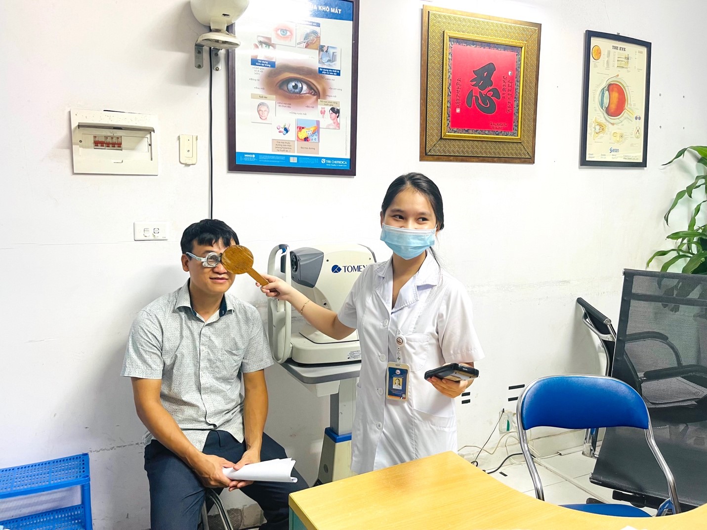Y, bác sĩ kiểm tra thị lực cho cán bộ công nhân viên, người lao động của Công ty Cổ phần Điện tử và Tin học Việt Nam