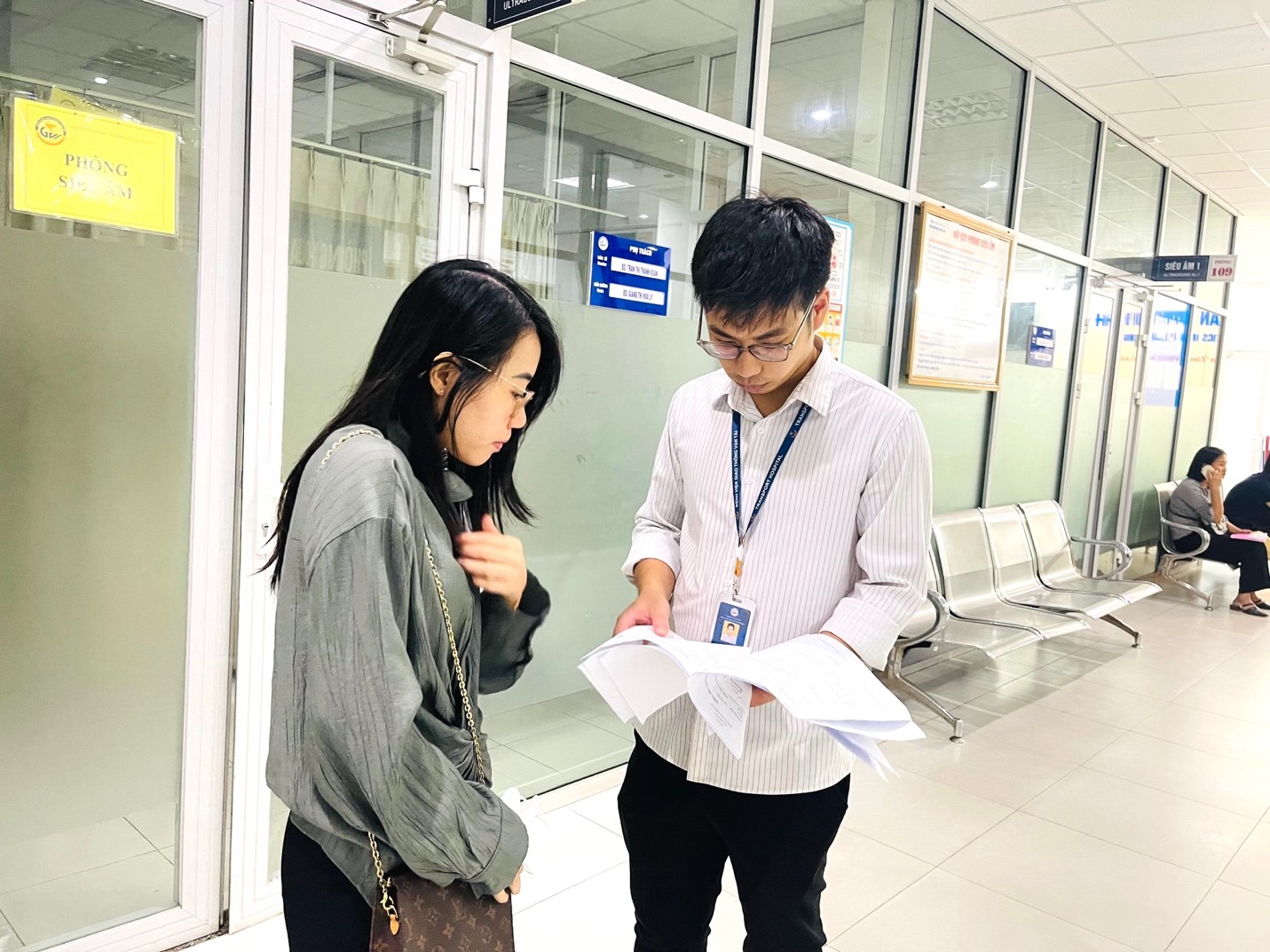Cán bộ hướng dẫn của Bệnh viện Giao thông vận tải giải đáp câu hỏi của khách hàng và hướng dẫn khách hàng khám theo các danh mục gói khám.