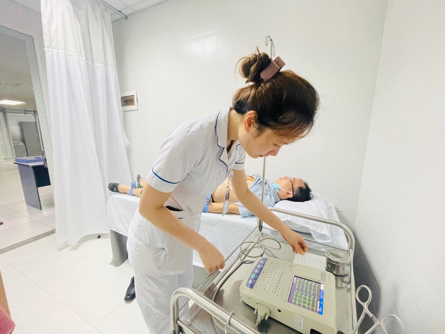 Các y, bác sĩ đo điện tim cho cán bộ nhân viên Công ty Cổ phần Điện tử và Tin học Việt Nam