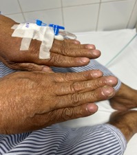 Khám lâm sàng cho thấy bệnh nhân có các dấu hiệu giảm oxy mạn tính (ngón tay, ngón chân dùi trống, tím môi) trên nền bệnh gan mạn tính (tuần hoàn bàng hệ dưới da vùng bụng (+), vú to, tiền sử giãn tĩnh mạch thực quản độ III đã thắt).
