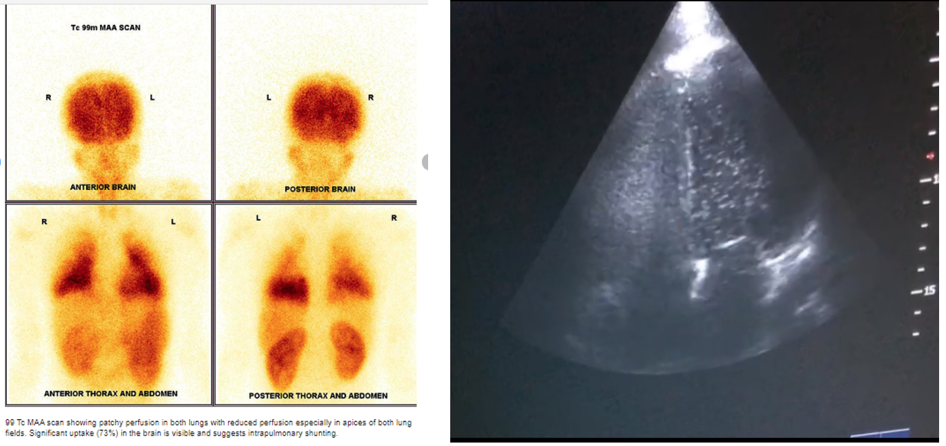 Với những bệnh nhân có HPS và bệnh phổi kẽ đồng mắc thì chụp xạ hình tưới máu phổi có sử dụng các thể tụ thập albumin huyết thanh người (macroaggregated albumin MAA đánh dấu phóng xạ Technetium 99m) là một lựa chọn. Các thụ thể MAA này với kích thước từ 20 – 50 um bình thường sẽ bị giữ lại ở hệ thống mao mạch phổi (kích thước 8 -15 um). Ở bệnh nhân HPS (shunt nối tắt trong phổi ) các thụ thể sẽ tái phân bố và tìm thấy ở gan, não, thận với tỉ lệ > 6%.