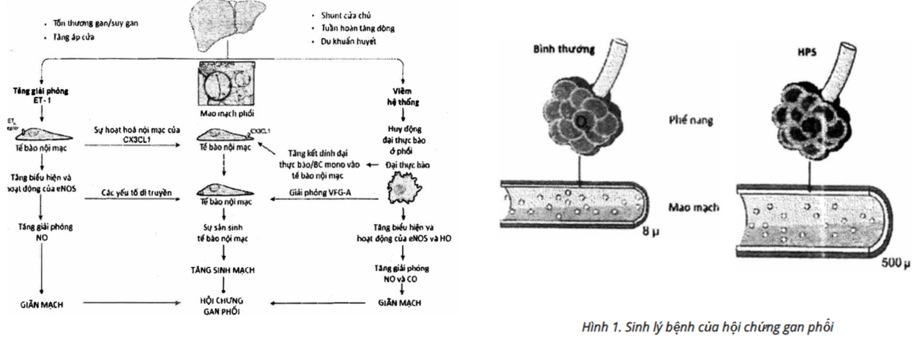 Cơ chế bệnh sinh của hội chứng gan phổi là sự tăng giải phóng oxit nitric (NO) từ các tế bào nội mạc do tình trạng suy gan, tăng áp lực tĩnh mạch cửa, đáp ứng viêm hệ thống bởi các du khuẩn huyết. Với sự tăng giải phóng oxit nitric vào tuần hoàn làm giãn mạch tuần hoàn phổi ở khu vực phế nang, đường kính các mạch máu này bình thường là 8 – 15um, khi có HPS đường kính này tăng lên đến 15 – 500um. Do vậy làm tăng chênh áp oxy phế nang – mao mạch, gây giảm oxy máu.