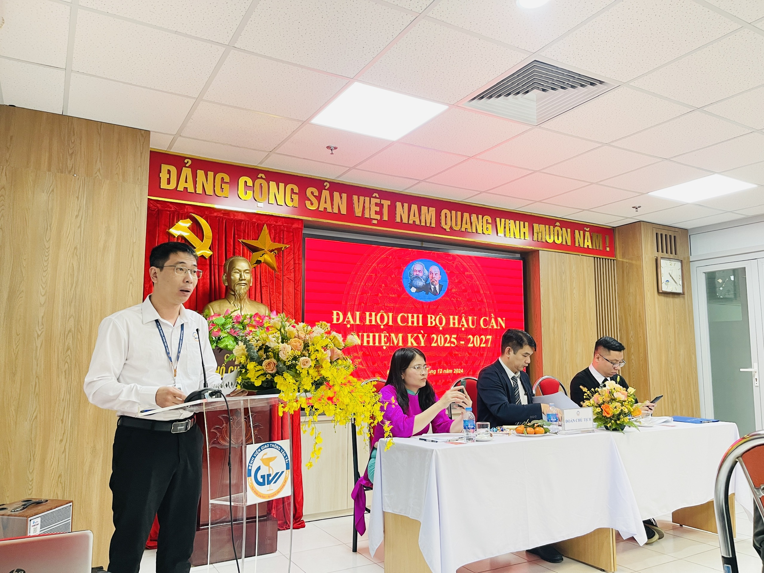 Báo cáo tại Đại hội, đồng chí Hà Quang Huy - Bí thư Chi bộ Hậu cần cho biết nhiệm kỳ qua, toàn đảng viên trong Chi bộ luôn có lập trường tư tưởng vững vàng, tuyệt đối tin tưởng vào đường lối lãnh đạo của Đảng. Chi bộ triển khai quán triệt và thực hiện nghiêm túc các Chỉ thị, Nghị quyết của cấp trên và vận dụng một cách linh hoạt sát với tình hình thực tế tại khoa, phòng mình. Đảng viên luôn gần gũi sâu sát tìm hiểu, nắm bắt tâm tư, nguyện vọng của quần chúng và giải quyết kịp thời các vướng mắc. Điều đó đã góp phần quan trọng cho việc thực hiện nhiệm vụ chuyên môn của đơn vị. 100% cán bộ, đảng viên trong Chi bộ thực hiện các chương trình, kế hoạch các Nghị quyết của Đảng ủy cấp trên.