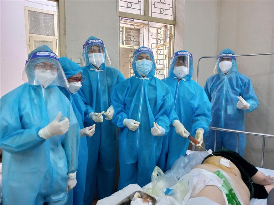 Tuy nhiên khi ổ áp xe chưa hoàn toàn nhuyễn hóa để có thể chọc hút thì bệnh nhân được phát hiện đã mắc Covid 19. Bệnh nhân được chuyển đến khu điều trị dành cho bệnh nhân F0 của bệnh viện và vẫn tiếp tục được theo dõi sát sao bởi các bác sỹ chuyên khoa. Đến sáng ngày 02/03/2022, sau khi cân nhắc các yếu tố tiên lượng, đánh giá lại toàn bộ các chỉ số cận lâm sàng và tình trạng bệnh nhân, các bác sỹ đã quyết định chọc hút ổ áp xe dưới hướng dẫn của siêu âm. Ê kíp gồm TS. BS. Bùi Sỹ Tuấn Anh – Trưởng khoa Ngoại Tổng hợp, ThS. BS. Trần Xuân Bách - khoa Chẩn đoán hình ảnh cùng các bác sỹ hồi sức tích cực và nội truyền nhiễm đã phối hợp thực hiện thành công thủ thuật cho bệnh nhân, hút ra hơn 200ml dịch mủ, đặt dẫn lưu kiểm soát. Sau thủ thuật bệnh nhân diễn biến tốt, không sốt, ăn uống được, sức khỏe dần ổn định.