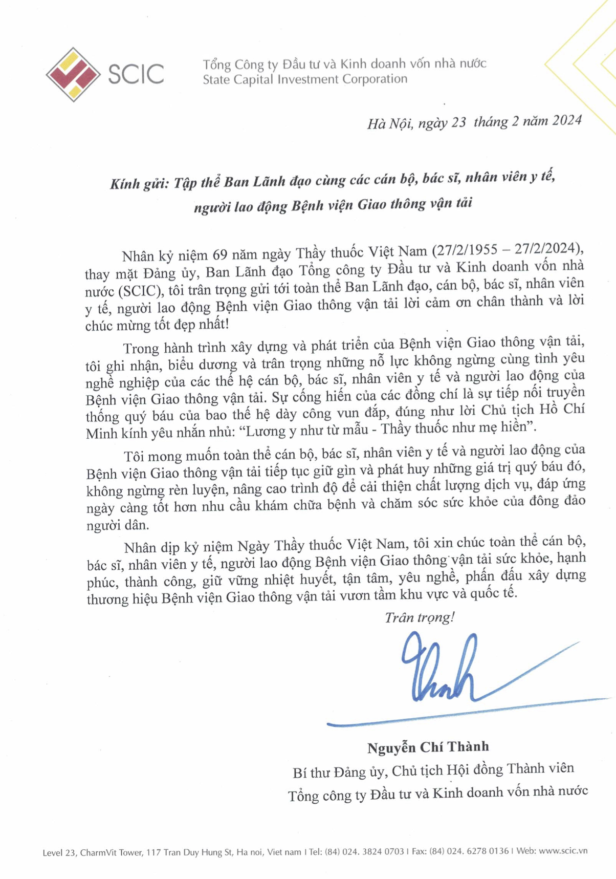 Nhân dịp kỷ niệm 69 năm Ngày Thầy thuốc Việt Nam (27/2/1955- 27/2/2024), Chủ tịch HĐTV SCIC Nguyễn Chí Thành đã gửi thư chúc mừng các thầy thuốc và nhân viên Bệnh viện Giao thông vận tải. Bệnh viện Giao thông vận tải xin giới thiệu toàn văn bức thư.