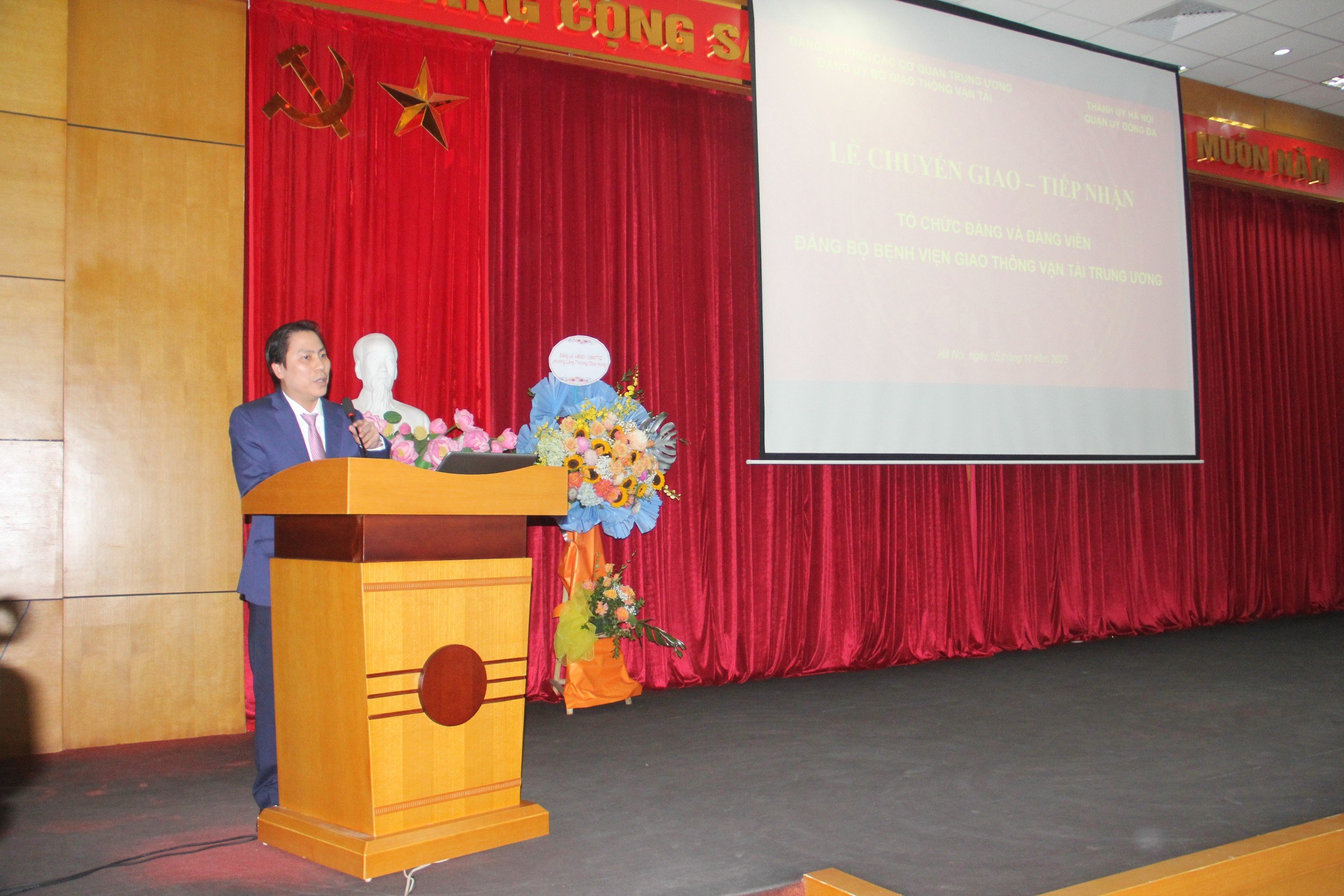 Tại buổi lễ, thừa ủy quyền của Thường trực Đảng ủy Bộ GTVT, đồng chí Vũ Đức Hiếu, Phó Trưởng Ban Tổ chức Đảng ủy Bộ GTVT đã công bố Quyết định số 1299-QĐ/ĐUK, ngày 22/9/2023 của Đảng ủy Khối các cơ quan Trung ương về việc chuyển giao tổ chức đảng và đảng viên. Thừa ủy quyền của Quận ủy Đống Đa, đồng chí Khúc Thị Hiền - Phó Trưởng Ban thường trực ban Tổ chức Quận ủy Đống Đa công bố Quyết định số 1660-QĐ/QU ngày 23/10/2023 của Quận ủy Đống Đa về việc tiếp nhận tổ chức đảng và đảng viên Đảng bộ Bệnh viện GTVT Trung ương. Theo đó, Đảng bộ Bệnh viện GTVT Trung ương gồm 06 chi bộ và 105 đảng viên từ trực thuộc Đảng ủy Cục Y tế GTVT thuộc Đảng bộ Bộ GTVT, Đảng bộ Khối các cơ quan Trung ương chuyển về trực thuộc Quận ủy Đống Đa thuộc Đảng bộ Thành phố Hà Nội.