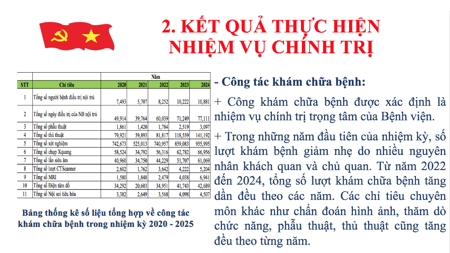 Đây là sự kiện chính trị quan trọng của Bệnh viện. Đại hội đã kiểm điểm, đánh giá kết quả thực hiện Nghị quyết Đại hội nhiệm kỳ 2020 - 2025, đồng thời đưa ra định hướng chiến lược phát triển toàn diện nhất trong nhiệm kỳ 2025 - 2030.