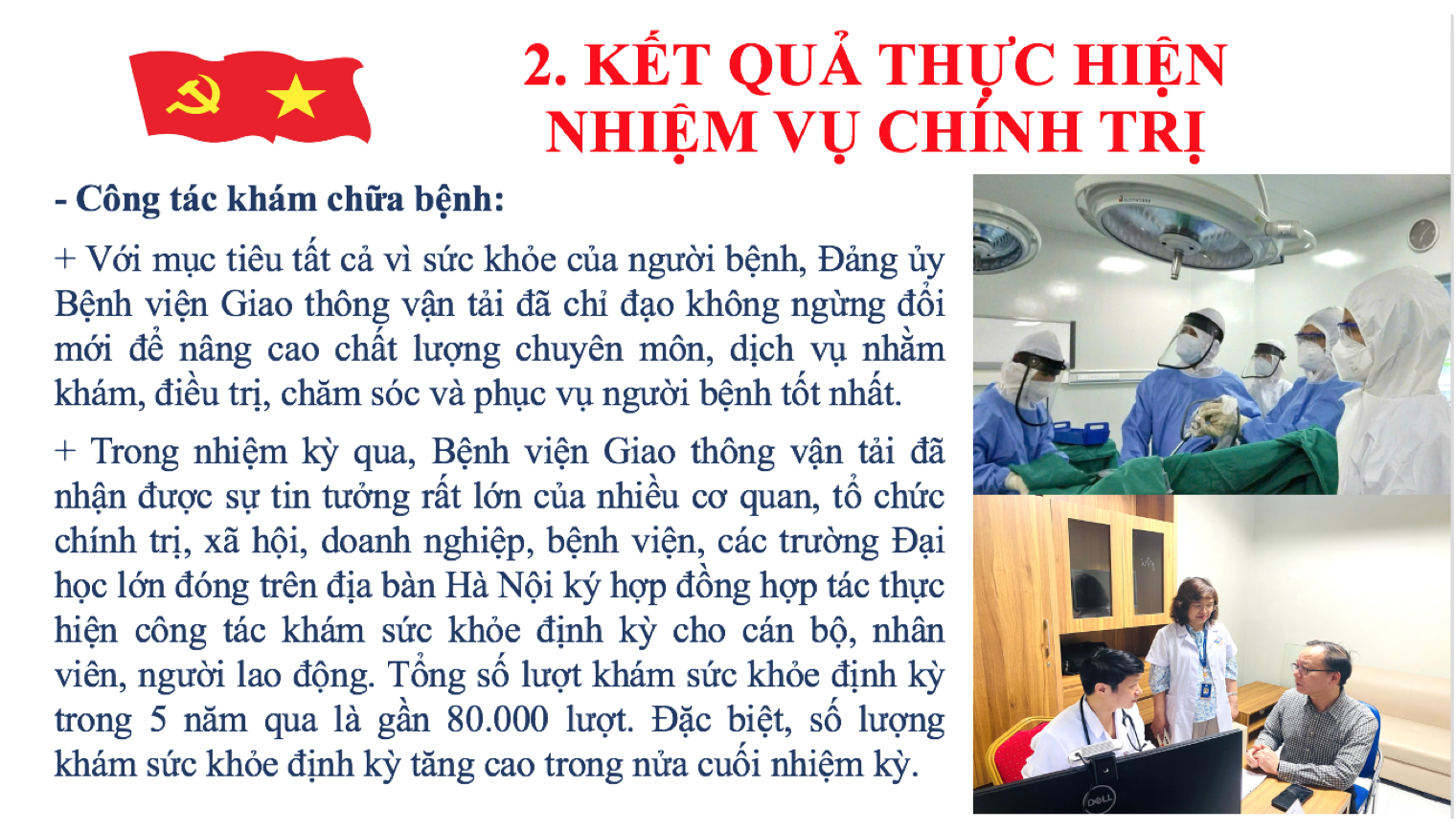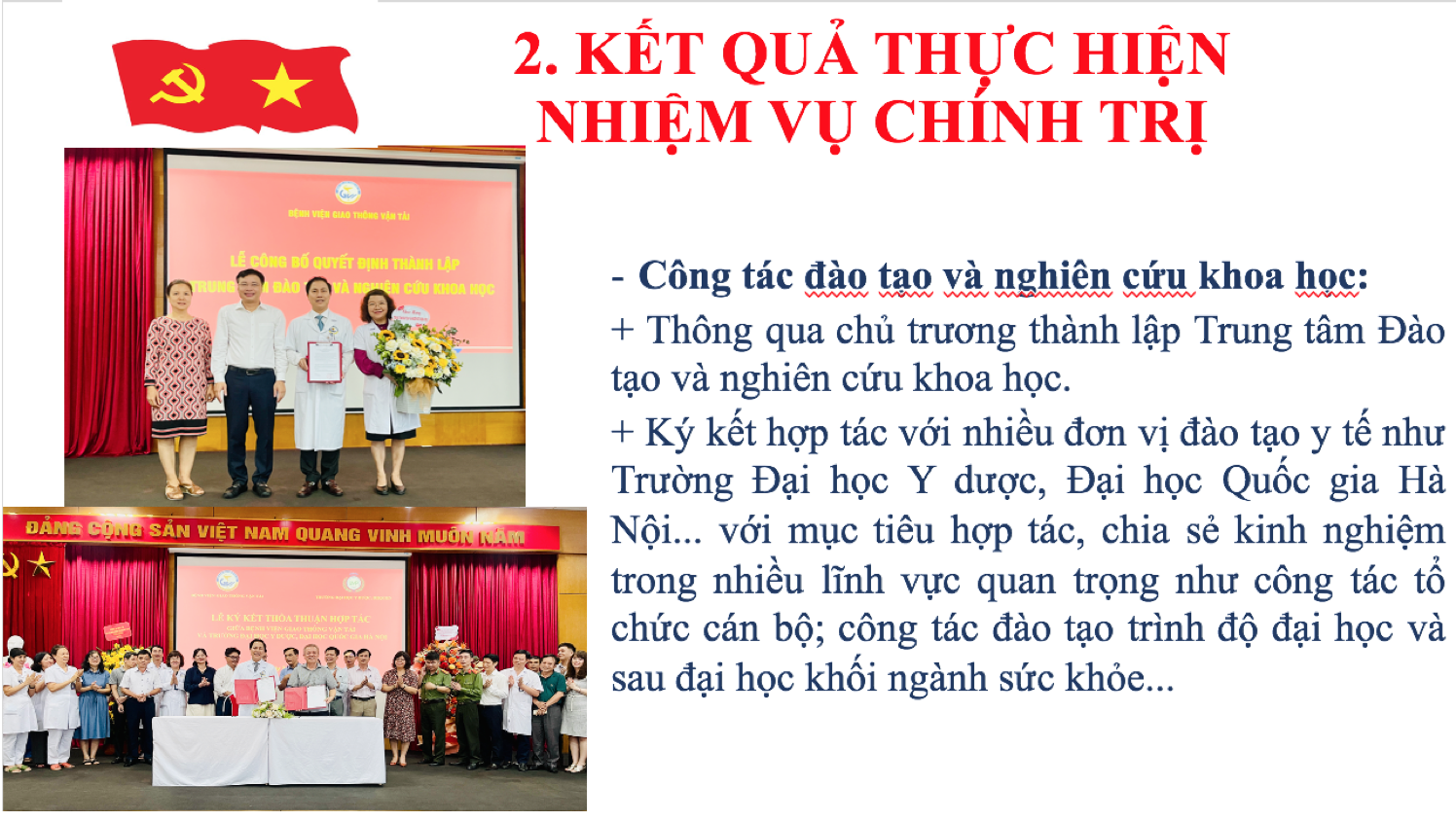Trong nhiệm kỳ 2020 - 2025, Đảng bộ Bệnh viện Giao thông vận tải đã phát huy truyền thống đoàn kết, đảm bảo vai trò lãnh đạo toàn diện, triệt để các hoạt động của Bệnh viện. Đảng bộ đã lãnh đạo Bệnh viện vượt qua thử thách trong điều kiện kinh tế còn nhiều khó khăn. Bệnh viện đoàn kết, ổn định, phát triển bền vững tạo được niềm tin với Đảng, Nhà nước, ngành Y tế và của xã hội.