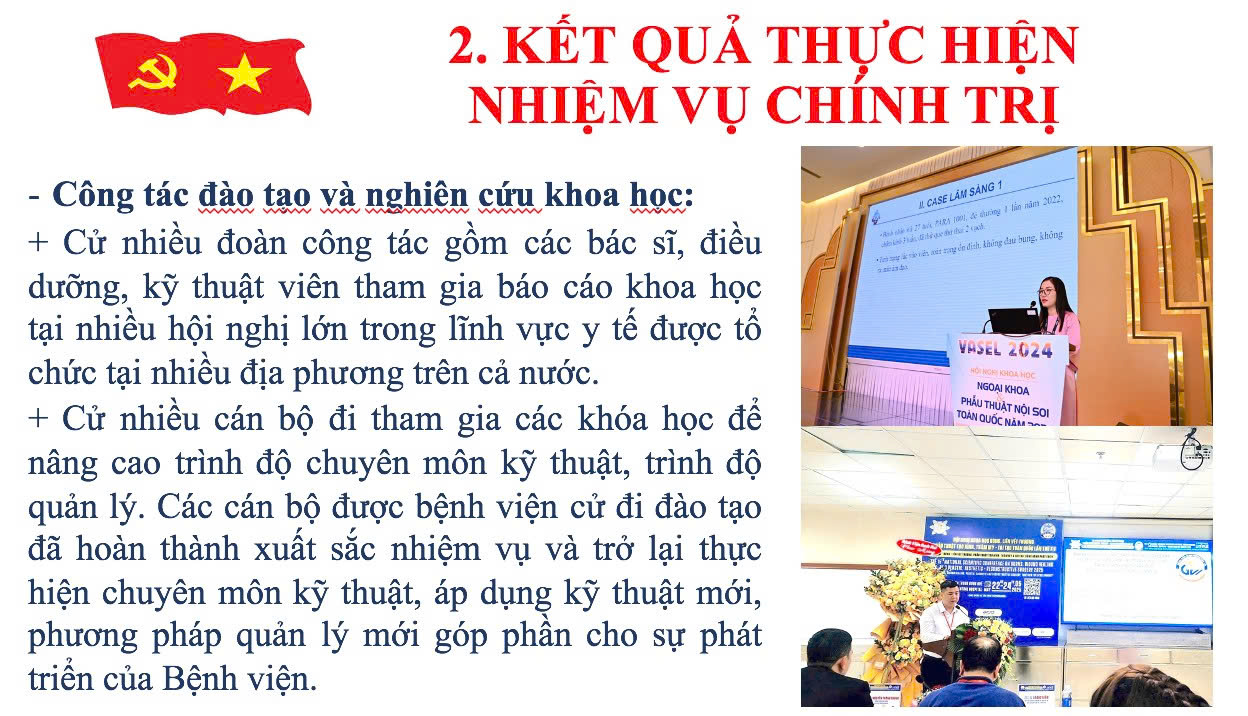 Để triển khai thực hiện mục tiêu này, Đảng ủy Bệnh viện quan tâm chỉ đạo, tổ chức thực hiện công tác bảo vệ chính trị nội bộ. Công tác kiểm tra, giám sát, kỷ luật của Đảng được tăng cường, có hiệu lực, hiệu quả hơn; thể hiện quyết tâm chính trị trong công tác đấu tranh phòng, chống tham nhũng, lãng phí. Công tác dân vận tiếp tục được quan tâm và có bước đổi mới. Đồng thời nâng cao chất lượng đội ngũ cán bộ nhân viên, người lao động của Bệnh viện; Tăng cường và hiện đại hoá cơ sở vật chất Bệnh viện và phát triển các nguồn lực tài chính theo hướng đa dạng hoá và bền vững.