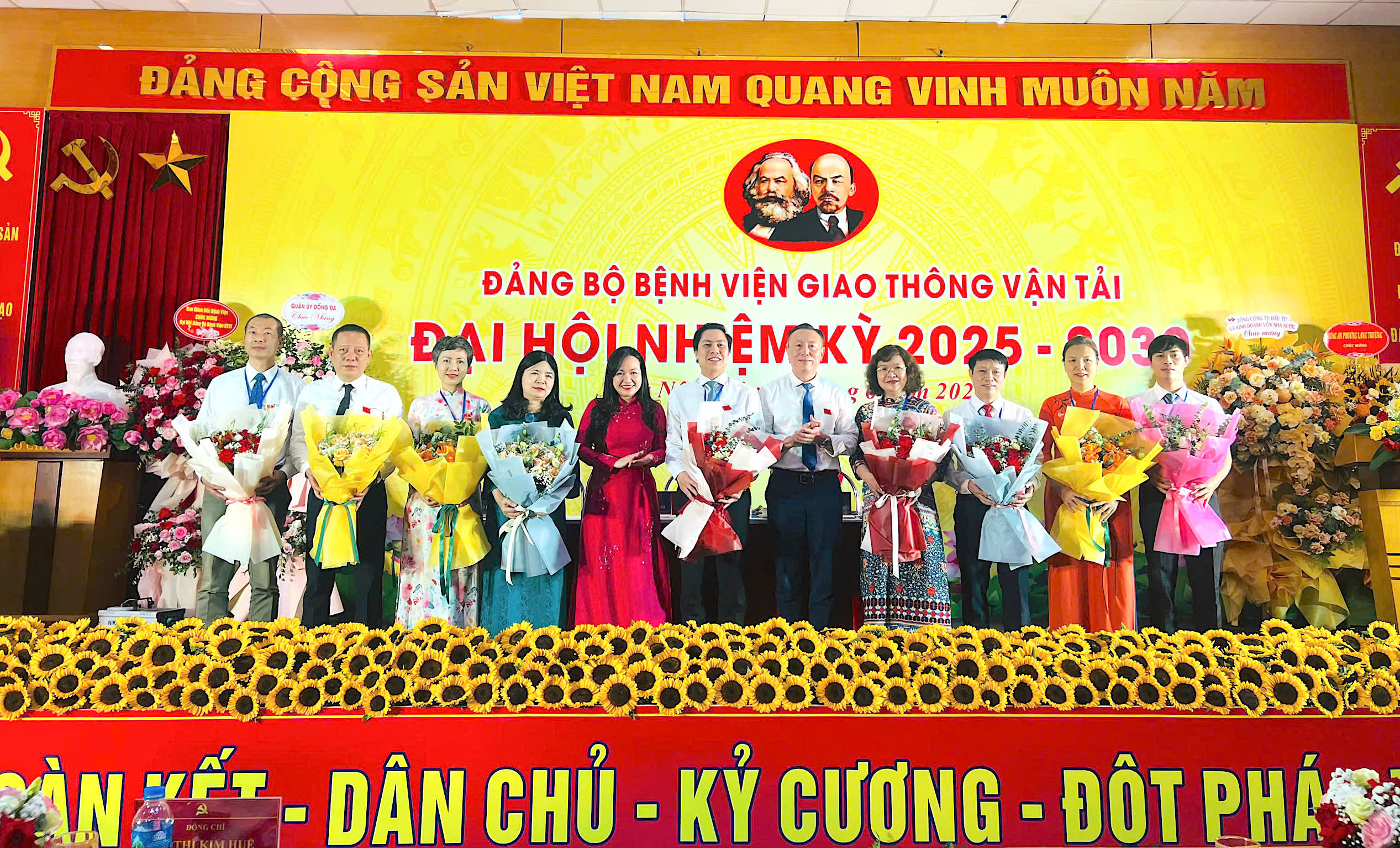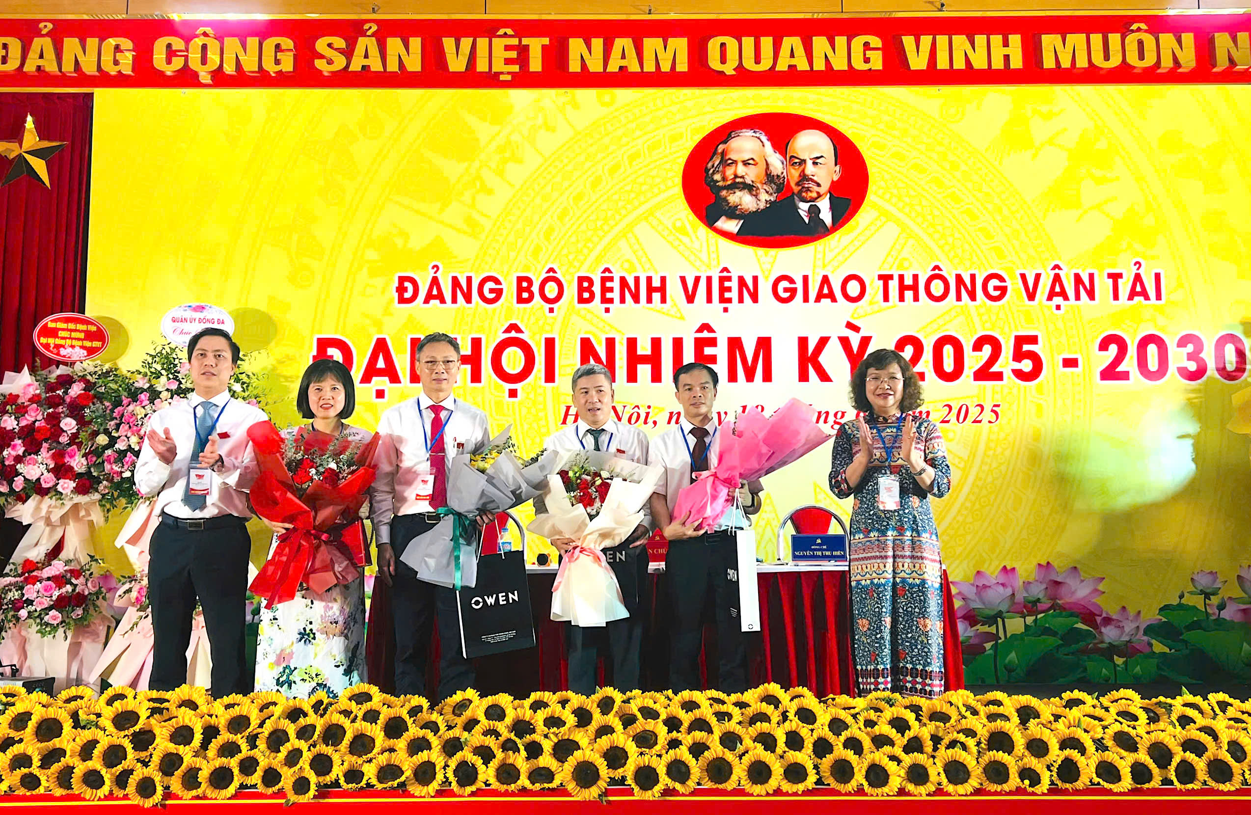 Đại diện lãnh đạo Quận ủy Đống Đa, Cục y tế Giao thông vận tải - Bộ Xây dựng tặng hoa Ban chấp hành Đảng bộ Bệnh viện Giao thông vận tải nhiệm kỳ 2025 - 2030.