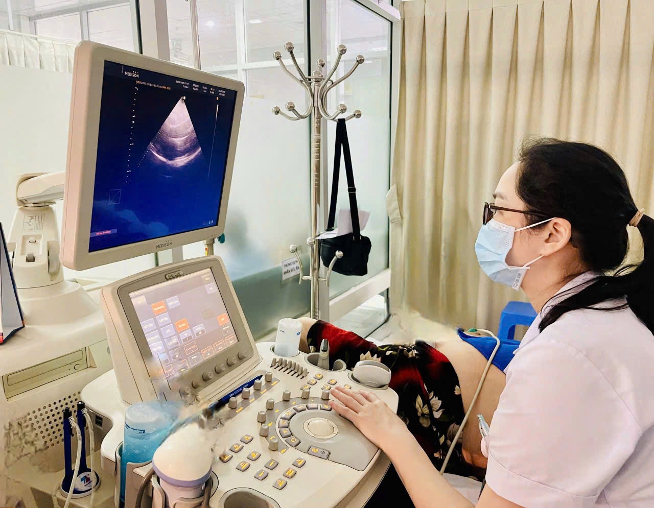 Bác sĩ Bệnh viện Giao thông vận tải siêu âm tim cho người bệnh.
