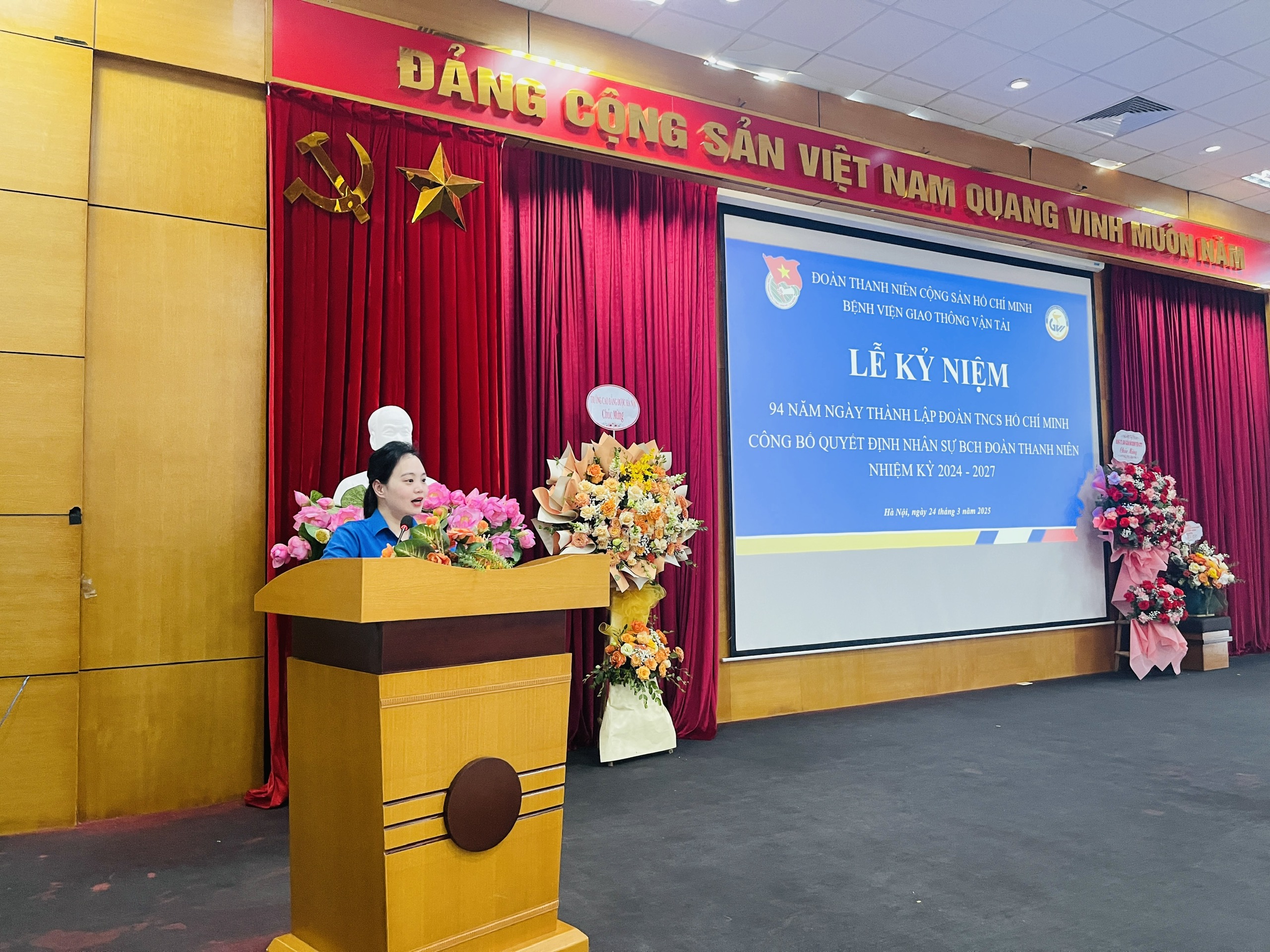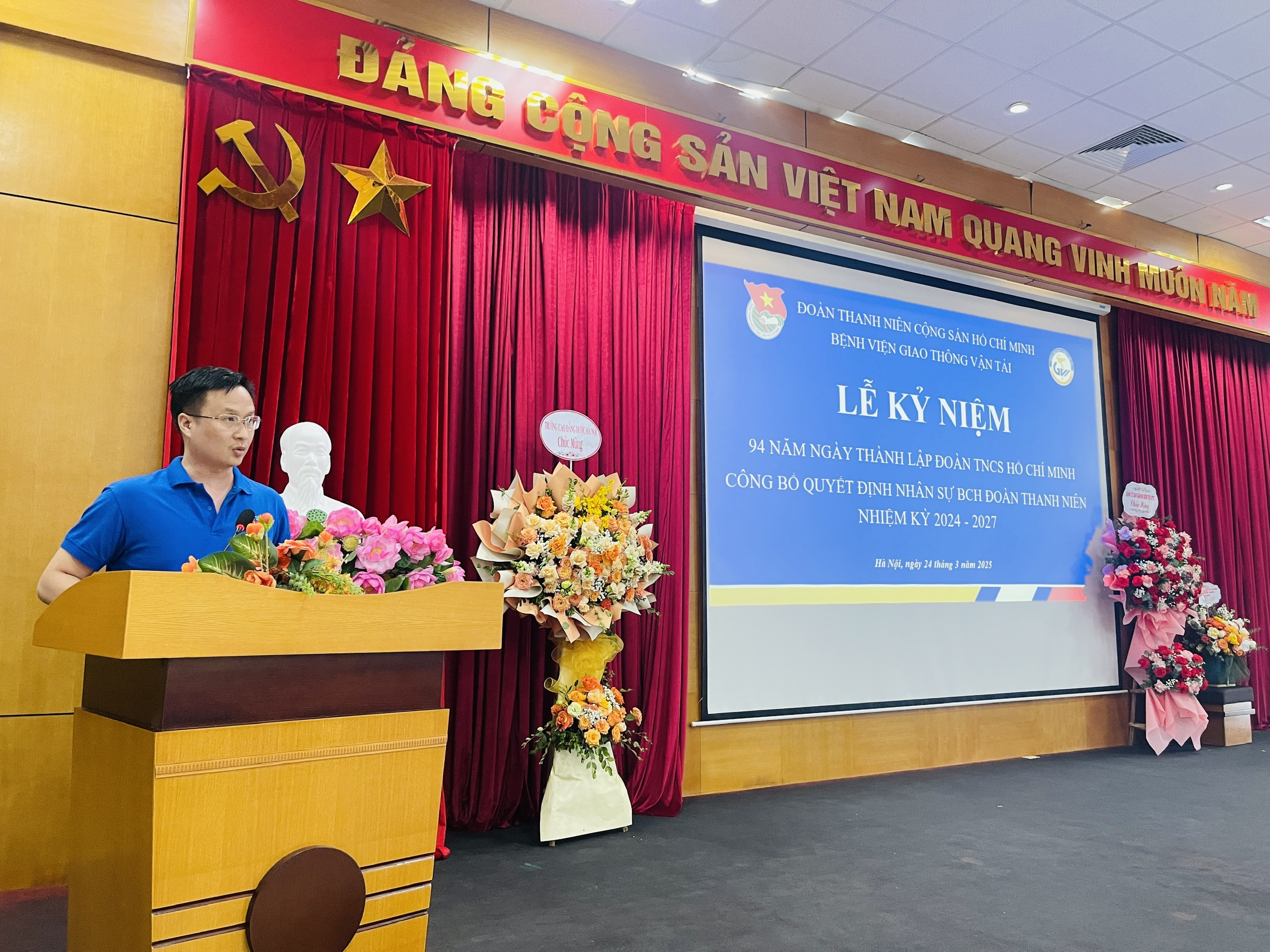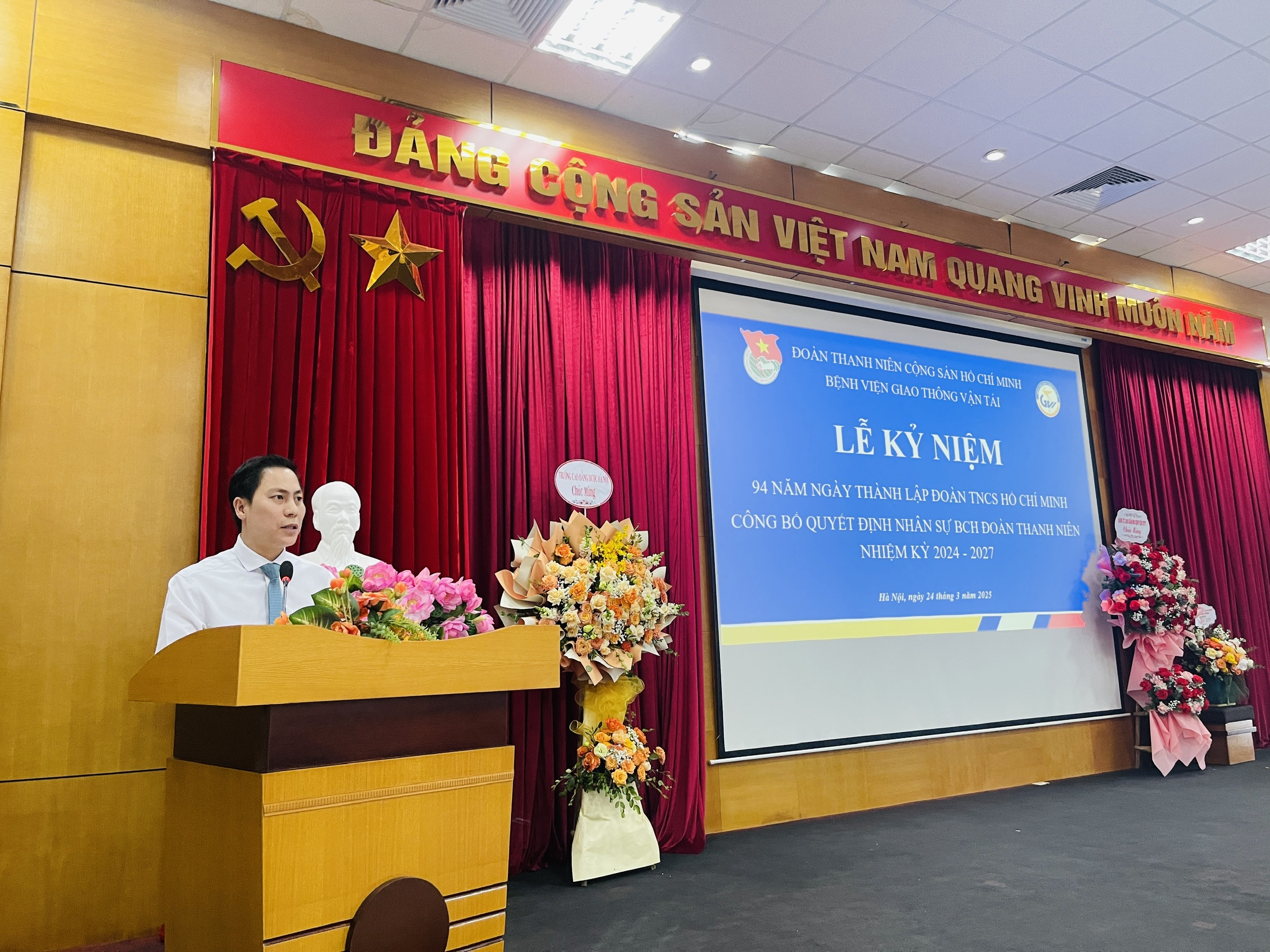 Phát biểu khai mạc buổi Lễ, Bí thư Đoàn Thanh niên Bệnh viện Giao thông vận tải Phùng Đức Thúy đã ôn lại lịch sử hào hùng của 94 năm thành lập và phát triển của Đoàn TNCS Hồ Chí Minh. Kể từ khi được thành lập và trong suốt 94 năm qua, dưới sự lãnh đạo của Đảng và Bác Hồ kính yêu, Đoàn TNCS Hồ Chí Minh đã không ngừng lớn mạnh, trở thành lực lượng nòng cốt xung kích trong sự nghiệp xây dựng và bảo vệ Tổ quốc. Ngày nay, trong thời đại mới, kỷ nguyên vươn mình của dân tộc, thanh niên Việt Nam đang đứng trước những cơ hội và thách thức to lớn. Thanh niên cần phát huy truyền thống vẻ vang, không ngừng học tập, rèn luyện, nâng cao trình độ chuyên môn, nghiệp vụ, tích cực tham gia các hoạt động xã hội góp phần xây dựng đất nước ngày càng giàu đẹp, văn minh.