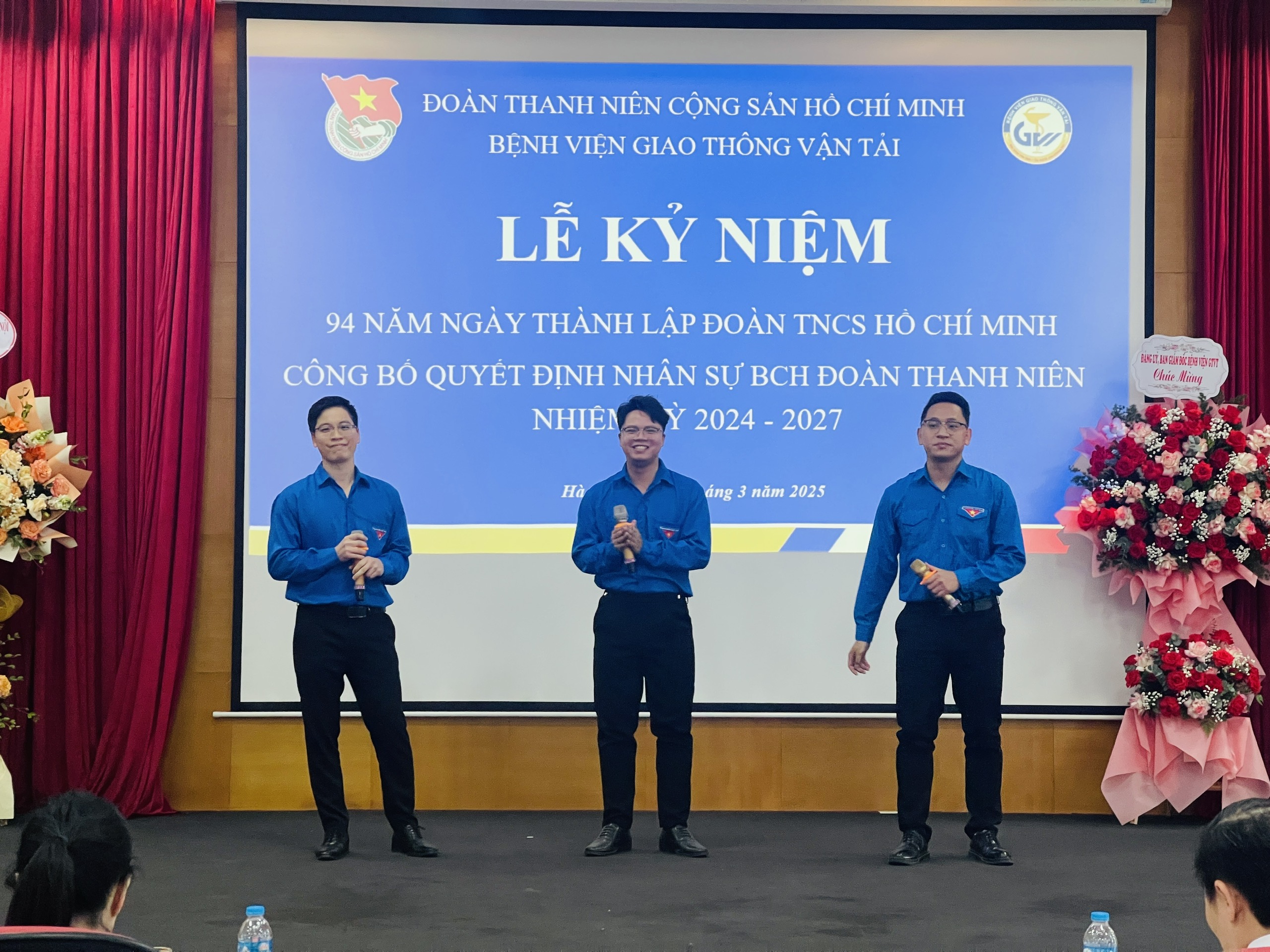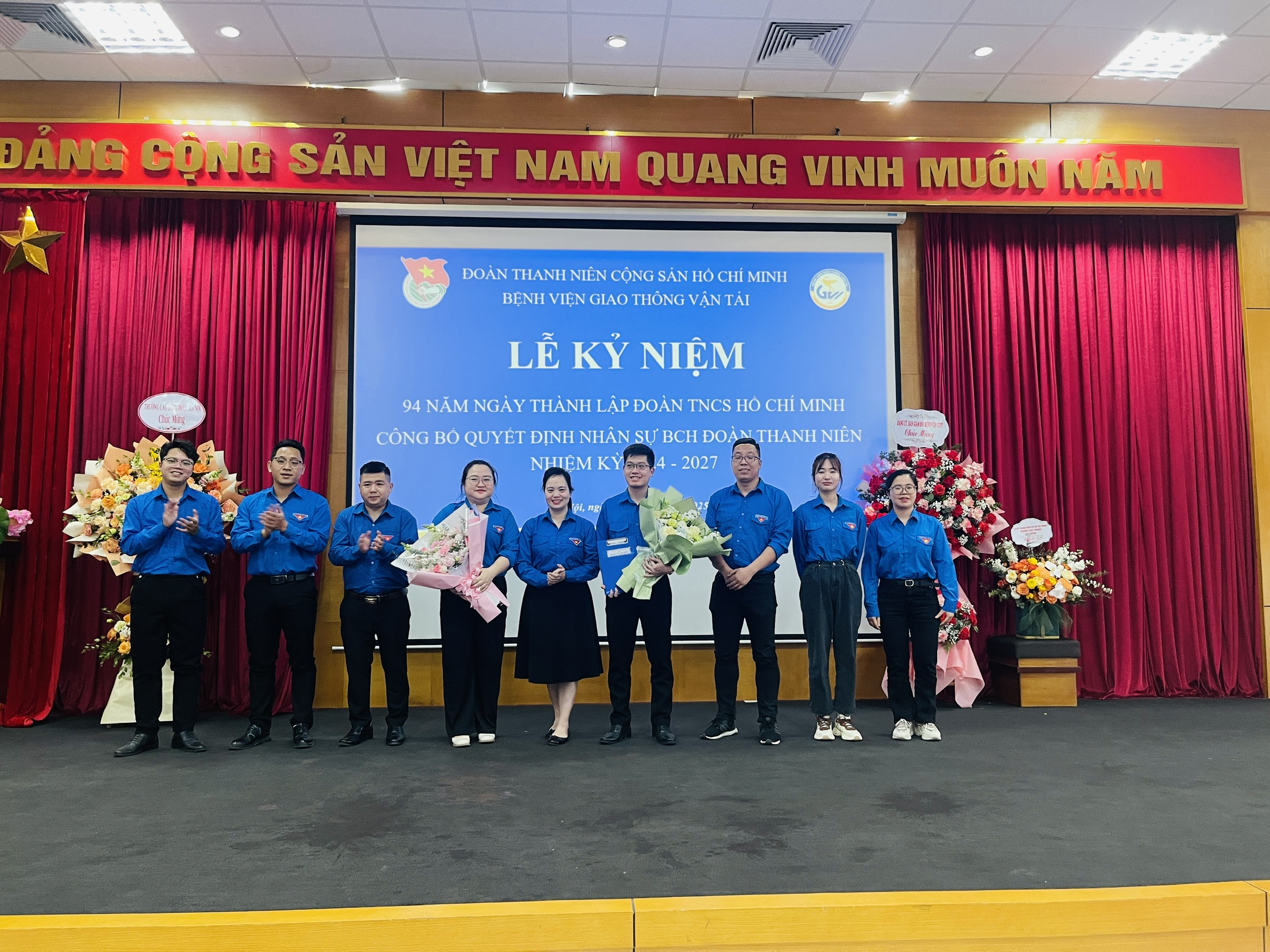 Tại buổi Lễ, Ban tổ chức đã triển khai công bố quyết định công nhận BCH và các chức danh Bí thư, Phó Bí thư Đoàn Thanh niên Bệnh viện Giao thông vận tải nhiệm kỳ 2024 - 2027. Trong đó, BCH mới gồm 09 đồng chí: đồng chí Trần Kiên - Bí thư Đoàn, đồng chí Nguyễn Nhật Linh - Phó Bí thư Đoàn, đồng chí Đỗ Khánh Nam - Ủy viên Ban Thường vụ Đoàn và các đồng chí ủy viên BCH Đoàn là Lê Quang Hiếu, Vương Minh Phương, Đỗ Mạnh Quyền, Võ Hoàng Thiên, Nguyễn Thị Thu Hường, Nguyễn Minh Thảo.