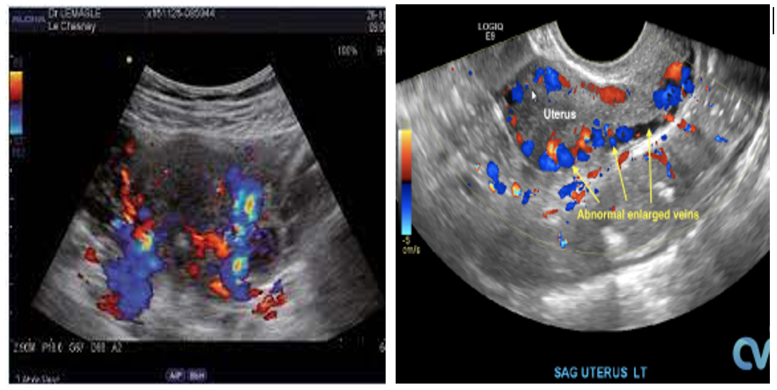 - Xác định nhiều cấu trúc tĩnh mạch giãn xung quanh tử cung (tránh nhầm lẫn với ứ dịch vòi trứng) – chẩn đoán giãn khi đường kính tĩnh mạch quanh tử cung trên 4mm, đường kính tĩnh mạch buồng trứng giãn trên 6mm.
