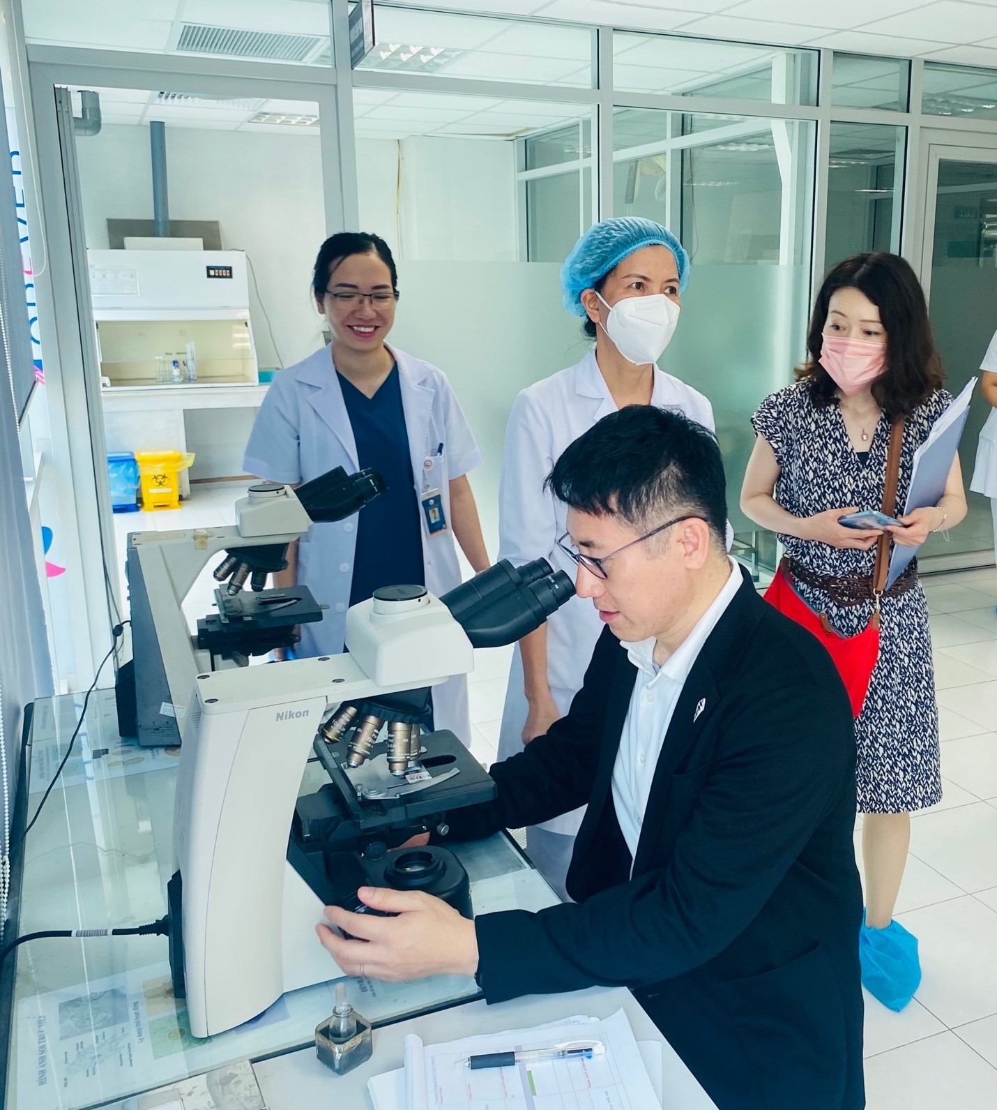 Đoàn thị sát của Nhật Bản kiểm tra thiết bị tại Khoa Xét nghiệm Bệnh viện Giao thông vận tải.