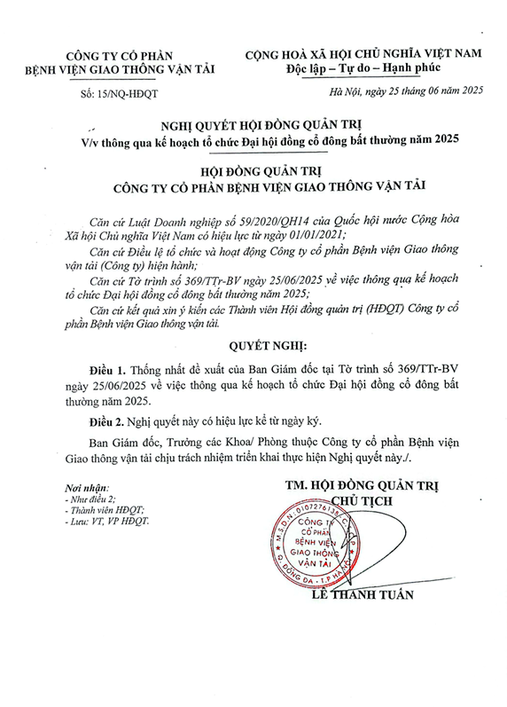 Nghị quyết số 15/NQ-HĐQT ngày 25/6/2025 của Hội đồng quản trị về việc thông qua Kế hoạch tổ chức ĐHĐCĐ bất thường năm 202517:02 - 25/06/2025Quan hệ cổ đông, Thông tin chung, Thông tin, Hội Đồng Quản Trị, Cơ Cấu Tổ Chức, Tải xuống ttr khtc đại hội cổ đông bất thường.pdf Tải xuống 1_số 15 - nq - 2025.pdfChia sẻ: