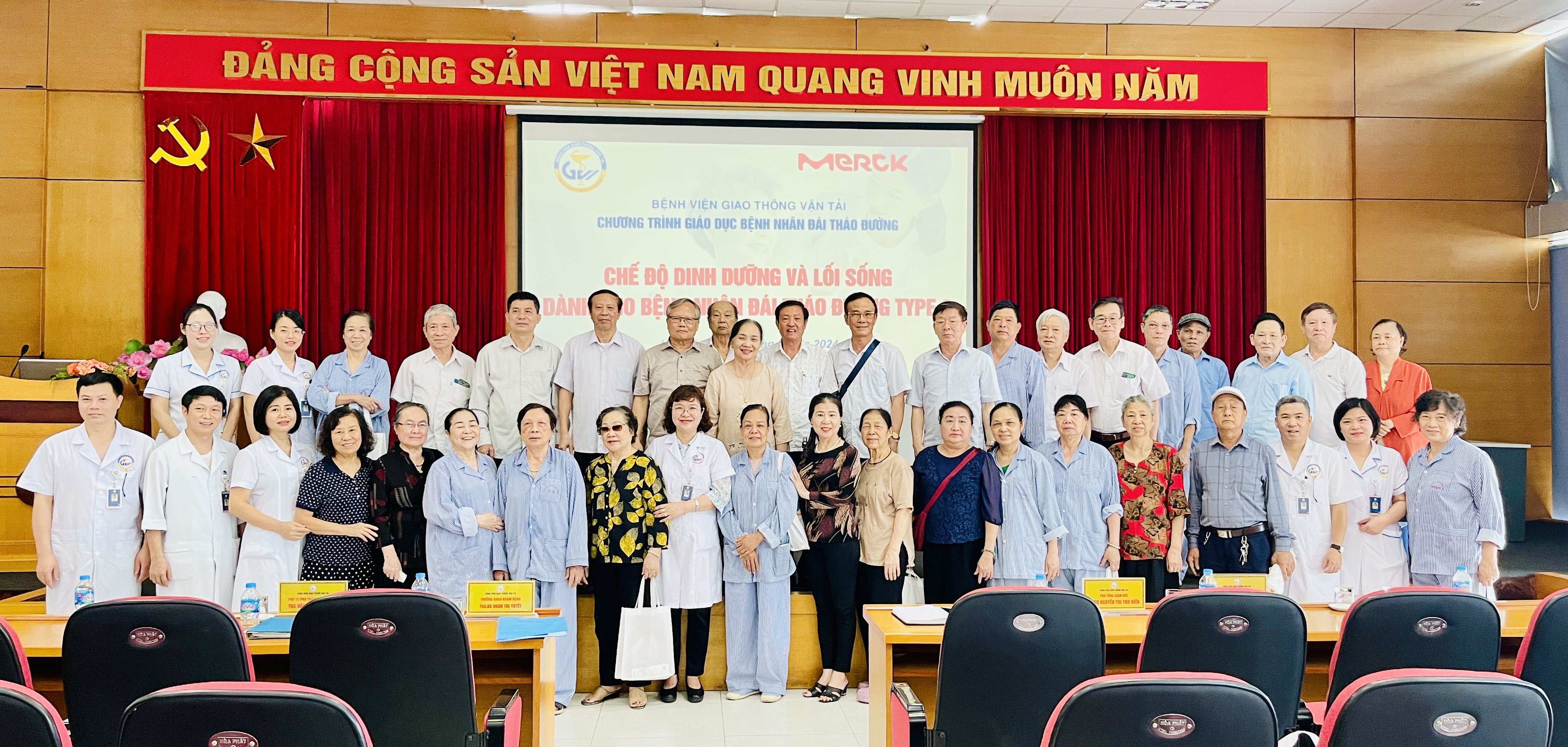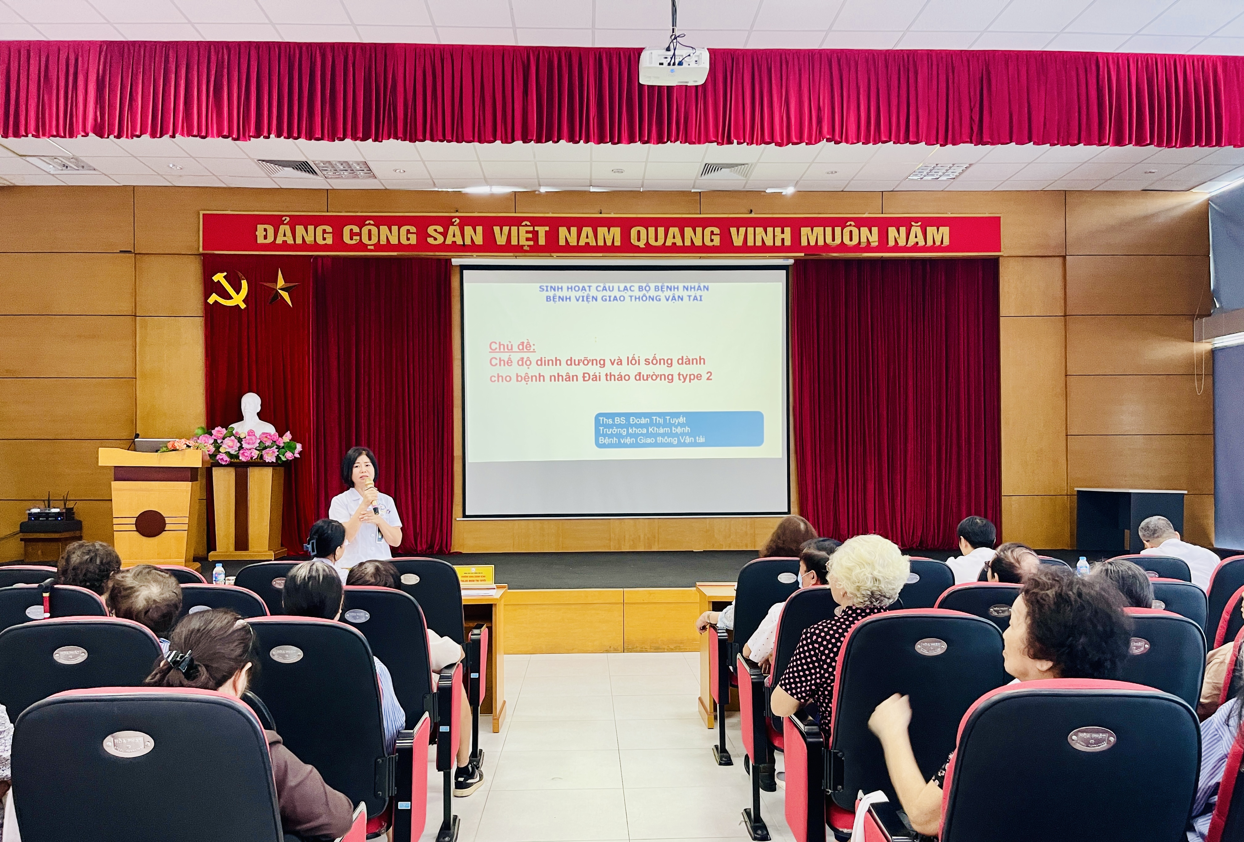 Tham dự buổi sinh hoạt có TS. BS Nguyễn Thị Thu Hiền – Phó TGĐ Bệnh viện, Trưởng khoa Nội A1; ThS. BS Đoàn Thị Tuyết – Trưởng khoa khám bệnh; BS CK II Bùi Hồng Giang – Trưởng khoa Cấp cứu, trưởng phòng Kế hoạch tổng hợp; ThS. BS Văn Thị Như Trang – Trưởng khoa nội tiết – cơ xương khớp; các lãnh đạo phòng ban và gần 100 người bệnh đái tháo đường đang được khám, theo dõi và điều trị tại Bệnh viện Giao thông vận tải.