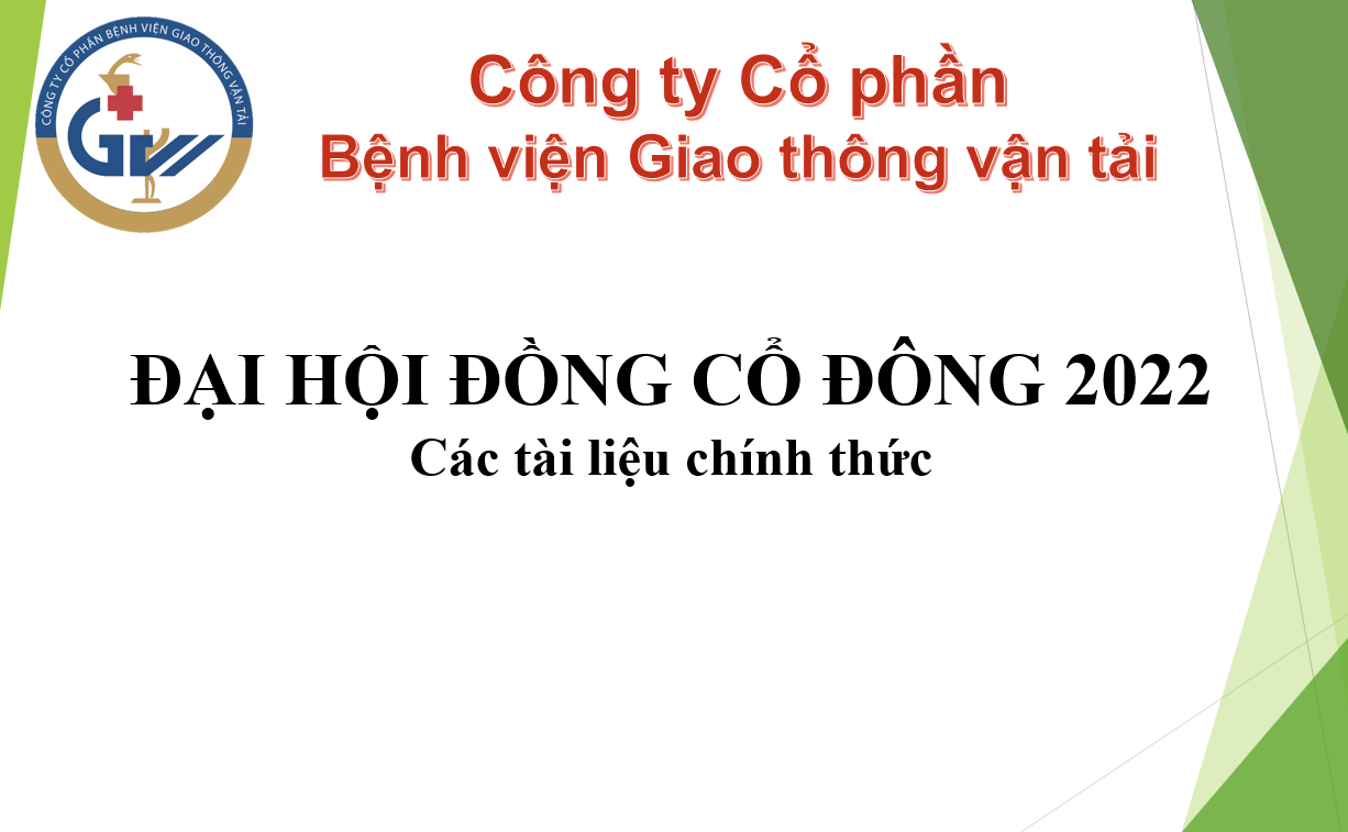 Tài liệu chính thức về Đại hội đồng cổ đông thường niên năm 202215:33 - 04/06/2022Thông tin chuyên môn, Quan hệ cổ đông, Thông tin chung, Thông tin, Hội đồng quản trị Công ty Cổ phần Bệnh viện Giao thông vận tải kính gửi tài liệu chính thức về Đại hội đồng cổ đông thường niên năm 2022 Tải xuống 1- thư mời đại hội.pdf Tải xuống 2- chương trình đh.pdf Tải xuống 3- giấy đăng ký tham dự đh.pdf Tải xuống 4- giấy ủy quyền đh.pdf Tải xuống 5- quy chế tổ chức đại hội.pdf Tải xuống 6- dự thảo quy chế đề cử, ứng cử, bầu cử thành viên hđqt.pdf Tải xuống 7- tờ trình số 1 thông qua sửa đổi điều lệ tổ chức và hoạt động của ctcp bệnh viện gtvt.pdf Tải xuống 8- báo cáo của bks về việc thực hiện nhiệm vụ năm 2021 và phương hướng hoạt động năm 2022.pdf Tải xuống 9- tờ trình số 2 thông qua đánh giá kết quả hđkd năm 2021, kế hoạch hđkd bệnh viện năm 2022.pdf Tải xuống 10- tờ trình số 3 thông qua quy chế hoạt động của hđqt.pdf Tải xuống 11- tờ trình số 4 thông qua quy chế hoạt động của bks.pdf Tải xuống 11a- Quy chế hoạt động của BKS.pdf Tải xuống 12- tờ trình số 5 thông qua quy chế quản trị nội bộ.pdf Tải xuống 13- tờ trình số 6 phê duyệt báo cáo tài chính đã kiểm toán.pdf Tải xuống 14- tờ trình số 7 thông qua định hướng phát triển ctcp bệnh viện gtvt.pdf Tải xuống 15- tờ trình số 8 thông qua bc thù lao hđqt, bks năm 2021 và kế hoạch thù lao hđqt, bks năm 2022.pdf Tải xuống 16- tờ trình số 9 thông qua việc lựa chọn đơn vị kiểm toán bc tài chính năm 2022.pdf Tải xuống 17- tờ trình số 10 thông qua việc hủy tư cách công ty đại chúng đối với ctcp bệnh viện gtvt.pdf Tải xuống 18-tờ trình số 11 thông qua việc miến nhiệm và bầu bổ sung thành viên hđqt.pdf Tải xuống 19- mẫu thẻ biểu quyết.pdf Tải xuống 20- mẫu phiếu biểu quyết các nội dung của đh.pdf Tải xuống 21- mẫu phiếu bầu bổ sung thành viên hđqt.pdf Tải xuống 22- dự thảo nghị quyết đhđcđ 2022.pdf Tải xuống 23-Biên bản ĐHĐCĐ 2022.pdf Tải xuống 24-nghị quyết đhđcđ 2022 .pdf Tải xuống 25-Điều lệ tổ chức và hoạt động CTCP Bệnh viện GTVT.pdf Tải xuống 26-Quy chế nội bộ về quản trị công ty của CTCP Bệnh viện GTVT.pdfChia sẻ: