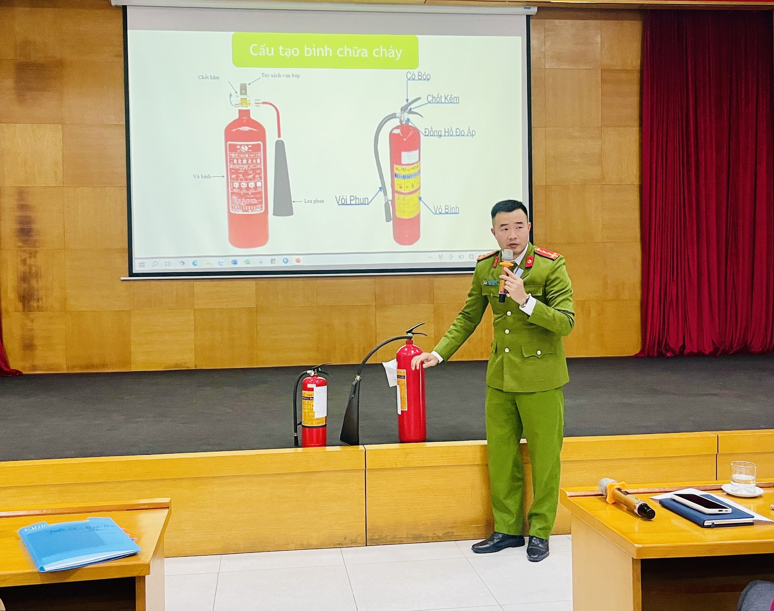 Đồng thời, đại úy Mai Danh Giang còn hướng dẫn công tác kiểm tra an toàn phòng cháy chữa cháy, các biện pháp phòng cháy chữa cháy tại Bệnh viện; phương án kiểm tra, bảo quản, bảo dưỡng, sử dụng phương tiện phòng cháy chữa cháy như bình bột, bình khí CO2.