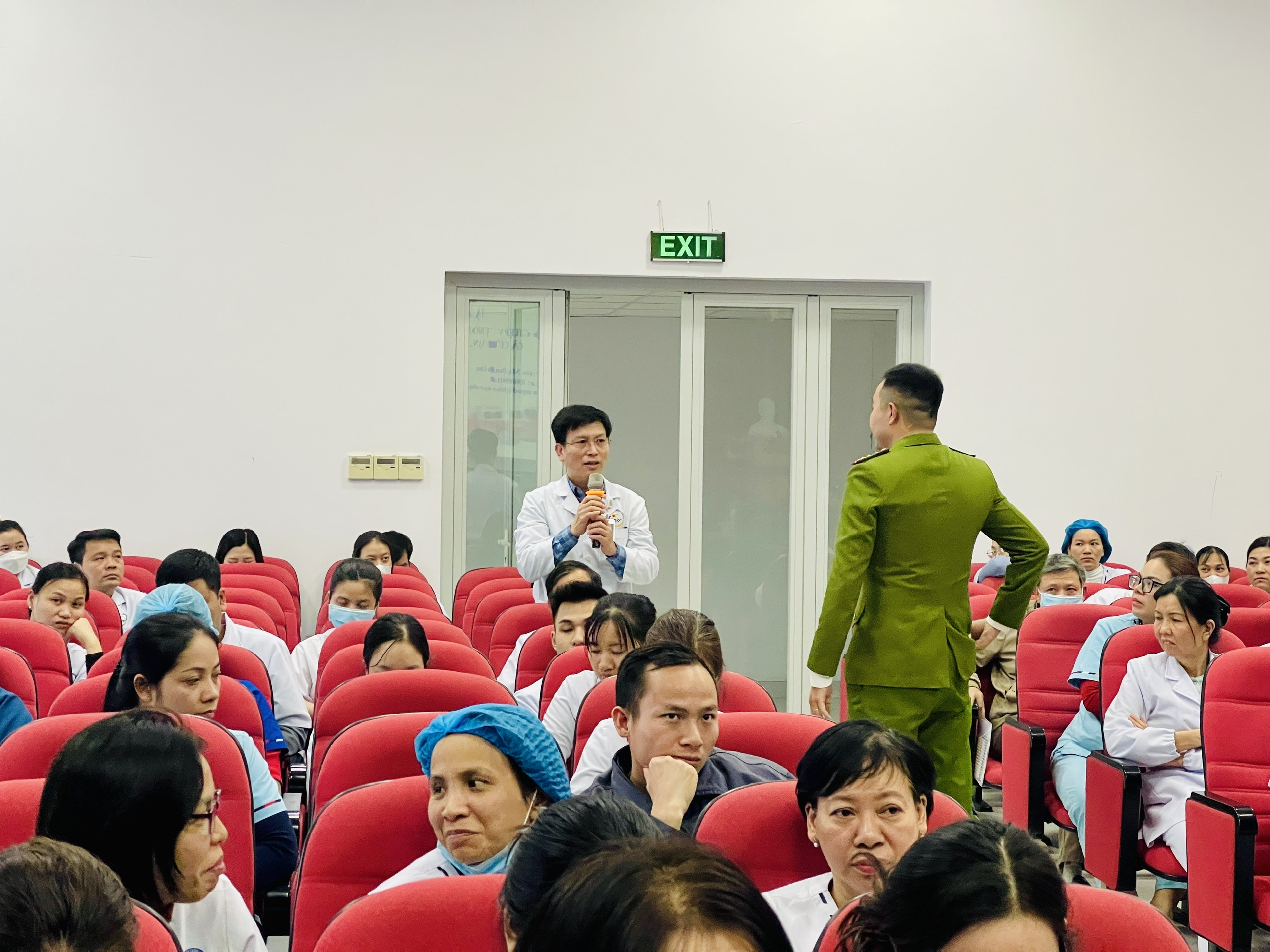 Tại buổi tập huấn, giảng viên đã giải đáp nhiều câu hỏi của cán bộ nhân viên Bệnh viện trong hoạt động phòng cháy chữa cháy