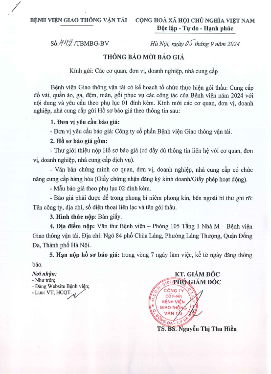 TB: Mời báo giá dịch vụ đồ vải, quần áo, ga, đệm, màn, gối phục vụ công tác của Bệnh viện GTVT năm 202414:12 - 06/09/2024Yêu cầu báo giá, Thông tin chung, Mời báo giá dịch vụ đồ vải, quần áo, ga, đệm, màn, gối phục vụ công tác của Bệnh viện GTVT năm 2024 Tải xuống TB- MỜI BÁO GIÁ.pdfChia sẻ: