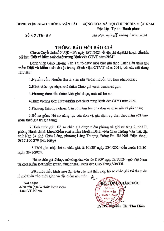 TB mời báo giá Diệt và kiểm soát chuột tại Bệnh viện GTVT 202413:58 - 22/01/2024Thông tin, Yêu cầu báo giá, Thông tin chung, TB mời báo giá Diệt và kiểm soát chuột tại Bệnh viện GTVT 2024 Tải xuống xử lý chuột.pdfChia sẻ: