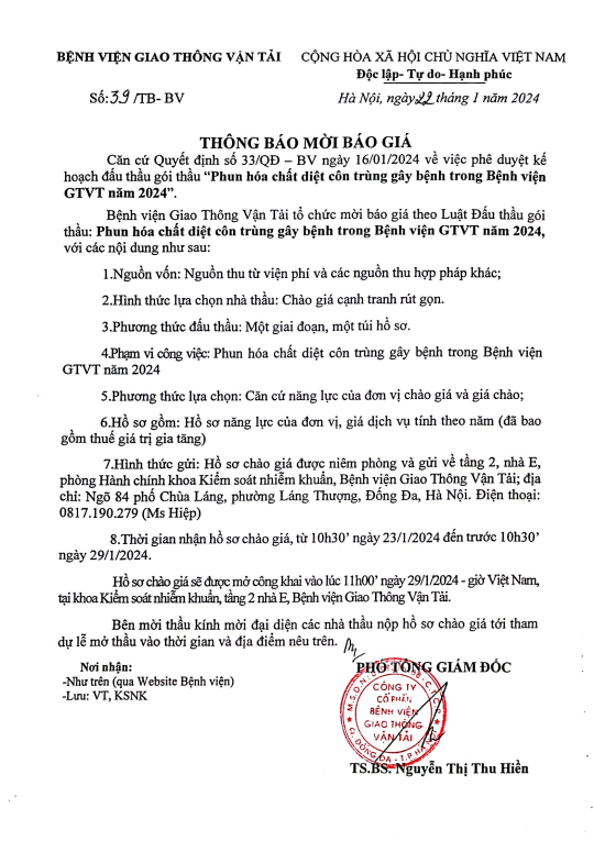 TB mời báo giá phun hóa chất14:00 - 22/01/2024Thông tin, Yêu cầu báo giá, Thông tin chung, TB mời báo giá phun hóa chất Tải xuống xử lý côn trùng.pdfChia sẻ:
