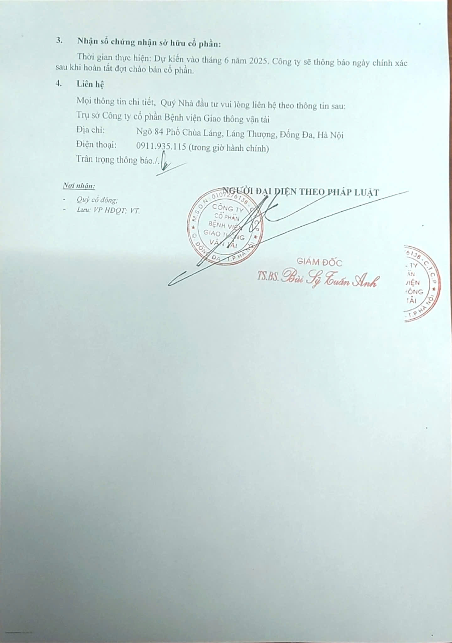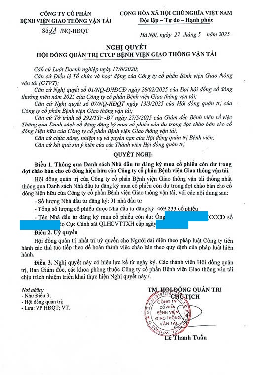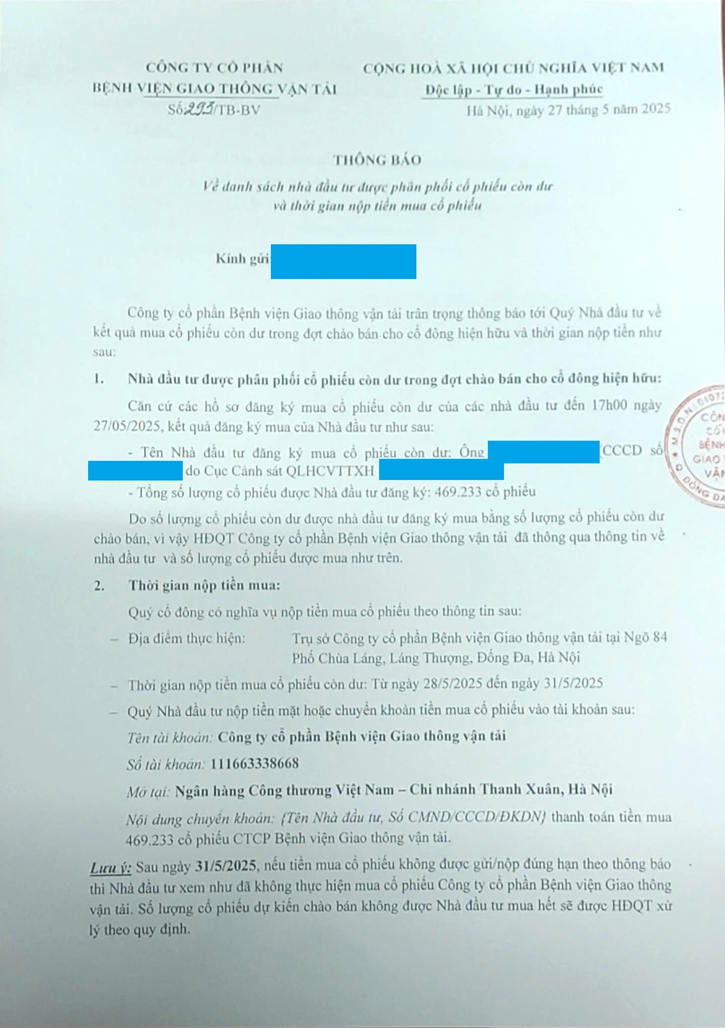 Công ty cổ phần Bệnh viện GTVT trân trọng thông báo tới Quý nhà đầu tư về kết quả mua cổ phiếu còn dư trong đợt chào bán cho cổ đông hiện hữu và thời gian nộp tiền như sau: