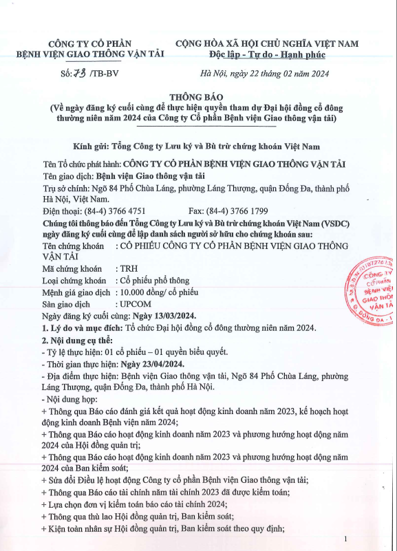 TB: Về ngày đăng ký cuối cùng để thực hiện quyền tham dự Đại hội đồng cổ đông thường niên năm 2024 của Công ty Cổ phần Bệnh viện Giao thông vận tải16:46 - 22/02/2024Quan hệ cổ đông, Thông tin chung, Thông tin, Hội Đồng Quản Trị, TB: Về ngày đăng ký cuối cùng để thực hiện quyền tham dự Đại hội đồng cổ đông thường niên năm 2024 của Công ty Cổ phần Bệnh viện Giao thông vận tải, như sau: Tải xuống 0- công bố thông tin 2024 f.pdfChia sẻ:
