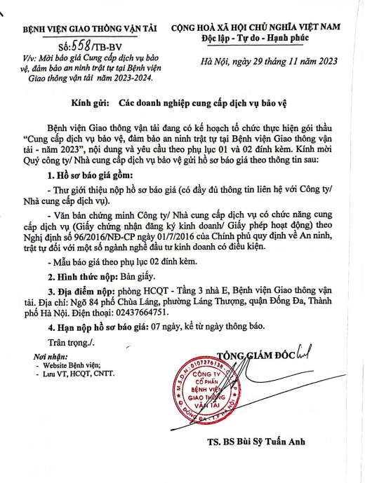 TB về việc mời báo giá Cung cấp dịch vụ bảo vệ, đảm bảo an ninh trật tự tại Bệnh viện Giao thông vận tải năm 2023 - 202415:32 - 30/11/2023Đấu thầu, Yêu cầu báo giá, Thông tin chung, TB về việc mời báo giá Cung cấp dịch vụ bảo vệ, đảm bảo an ninh trật tự tại Bệnh viện Giao thông vận tải năm 2023 - 2024 Tải xuống Báo giá cung cấp dịch vụ bảo vệ.pdfChia sẻ: