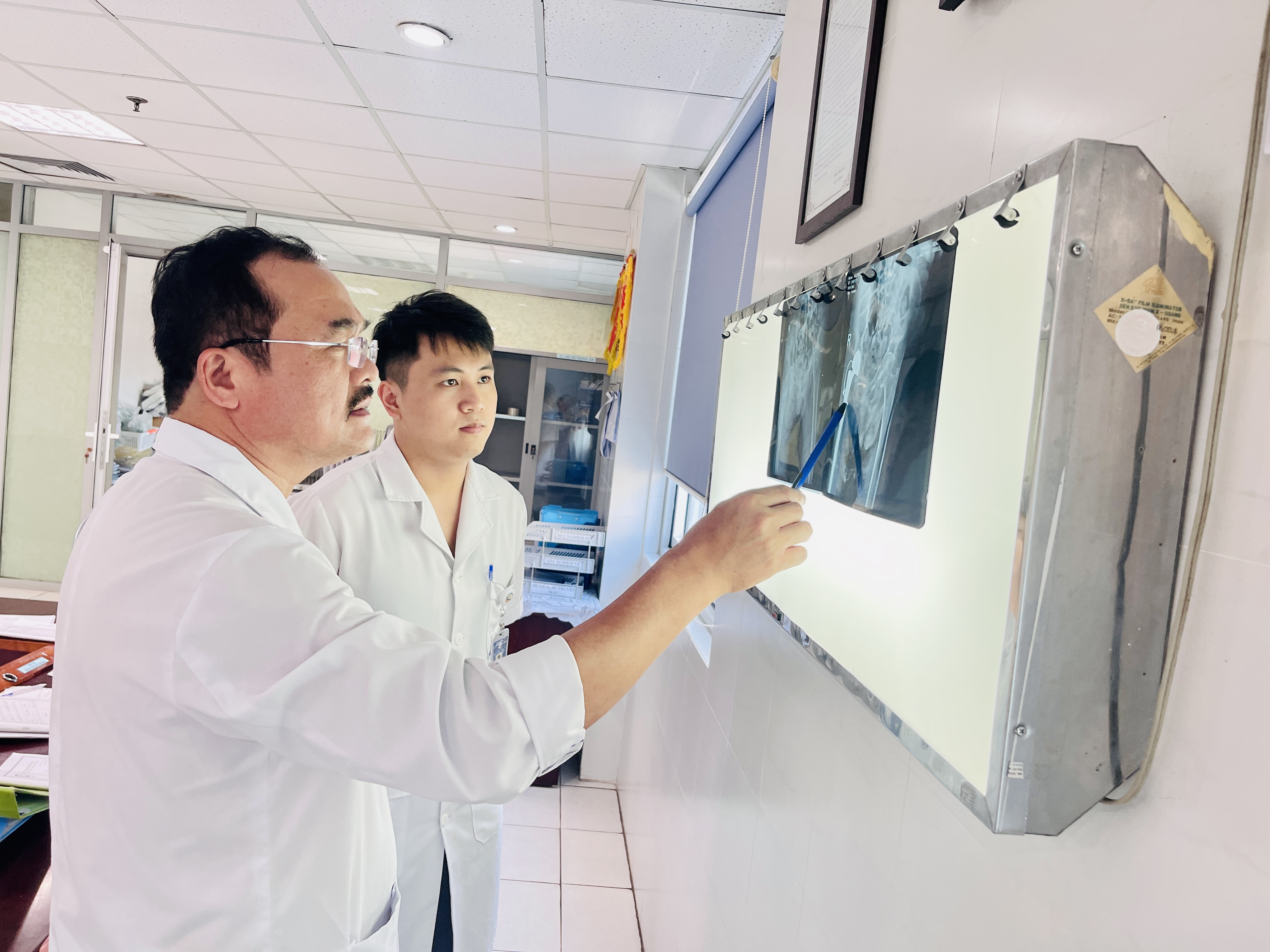 BSCKII Trương Hữu Đức - Trưởng khoa Chấn thương chỉnh hình và bác sĩ Nguyễn Văn Thinh kiểm tra phim chụp của bệnh nhân trước và sau khi phẫu thuật.