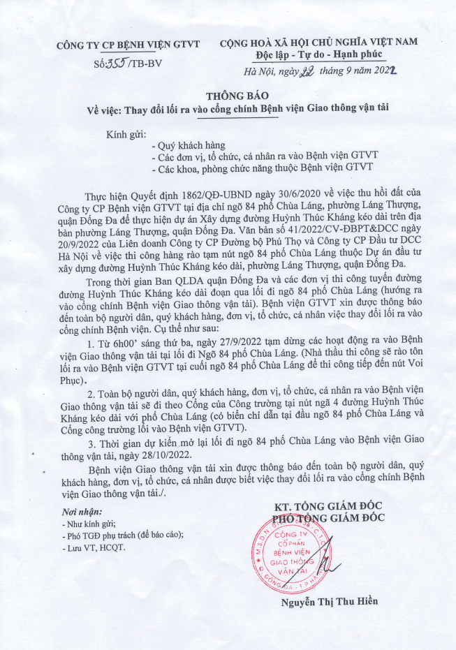 THÔNG BÁO10:18 - 23/09/2022Thông tin chung, Thông tin, Về việc: Thay đổi lối ra vào cổng chính Bệnh viện Giao thông vận tải File thông báo đính kèm: Tải xuống 355.pdfChia sẻ: