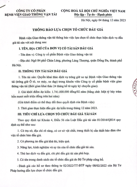 Thông báo lựa chọn tổ chức đấu giá14:09 - 05/12/2023Yêu cầu báo giá, Đấu thầu, Thông tin chung, Bệnh viện GTVT thông báo việc lựa chọn tổ chức thực hiện dịch vụ đấu giá tài sản với nội dung sau: Tải xuống Đấu giá quyền khai thác dịch vụ trông giữ xe.pdfChia sẻ: