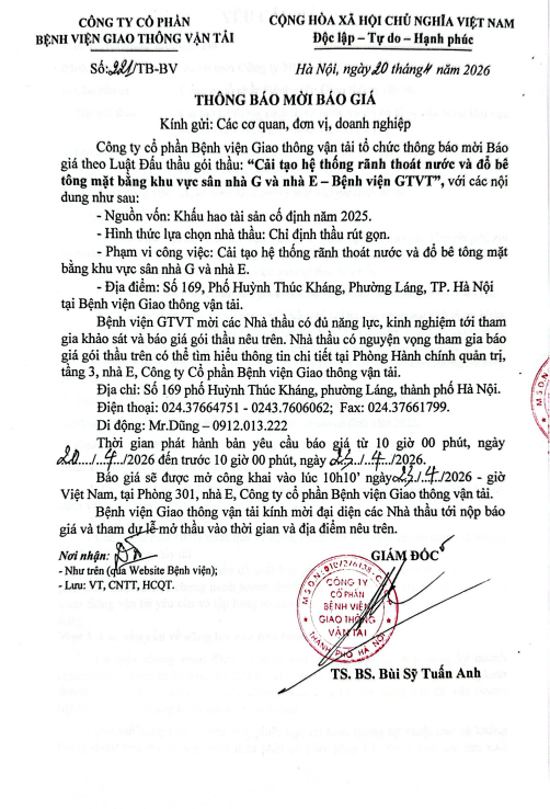 THÔNG BÁO MỜI BÁO GIÁ Cải tạo hệ thống rãnh thoát nước và đổ bê tông mặt bằng khu vực sân nhà G và nhà E – Bệnh viện GTVT15:05 - 20/04/2026Yêu cầu báo giá, Đấu thầu, Thông tin chung, Công ty cổ phần Bệnh viện Giao thông vận tải tổ chức thông báo mời Báo giá theo Luật Đấu thầu gói thầu: “Cải tạo hệ thống rãnh thoát nước và đổ bê tông mặt bằng khu vực sân nhà G và nhà E – Bệnh viện GTVT”, với các nội dung như sau Tải xuống TB-moi-bao-gia-san-betong-ge.pdfChia sẻ: