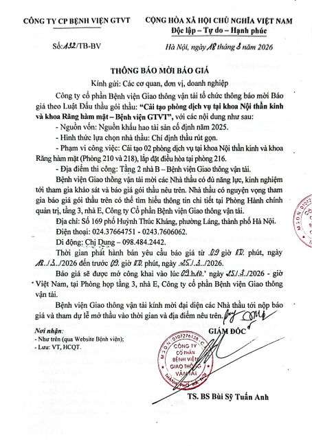 Công ty cổ phần Bệnh viện Giao thông vận tải tổ chức thông báo mời Báo giá theo Luật Đấu thầu gói thầu: “Cải tạo phòng dịch vụ tại khoa Nội thần kinh và khoa Răng hàm mặt – Bệnh viện GTVT”, với các nội dung như sau