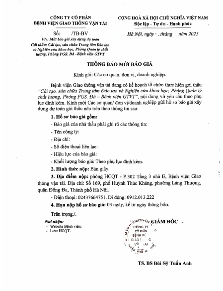 Bệnh viện Giao thông vận tải đang có kế hoạch tổ chức thực hiện gói thầu “Cải tạo, sửa chữa Trung tâm Đào tạo và Nghiên cứu khoa học, Phòng Quản lý chất lượng, Phòng PGS. Đà – Bệnh viện GTVT”, nội dung và yêu cầu theo phụ lục đính kèm. Kính mời Các cơ quan/ đơn vị/doanh nghiệp gửi hồ sơ báo giá xây dựng dự toán gói thầu nêu trên.
