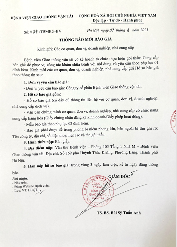 Thông báo mời báo giá: Cung cấp bàn ghế để phục vụ công tác khám chữa bệnh năm 202517:41 - 07/08/2025Thông tin, Yêu cầu báo giá, Thông tin chung, Tải xuống tb mời báo giá số484 ngày 07-8-2025.pdfChia sẻ: